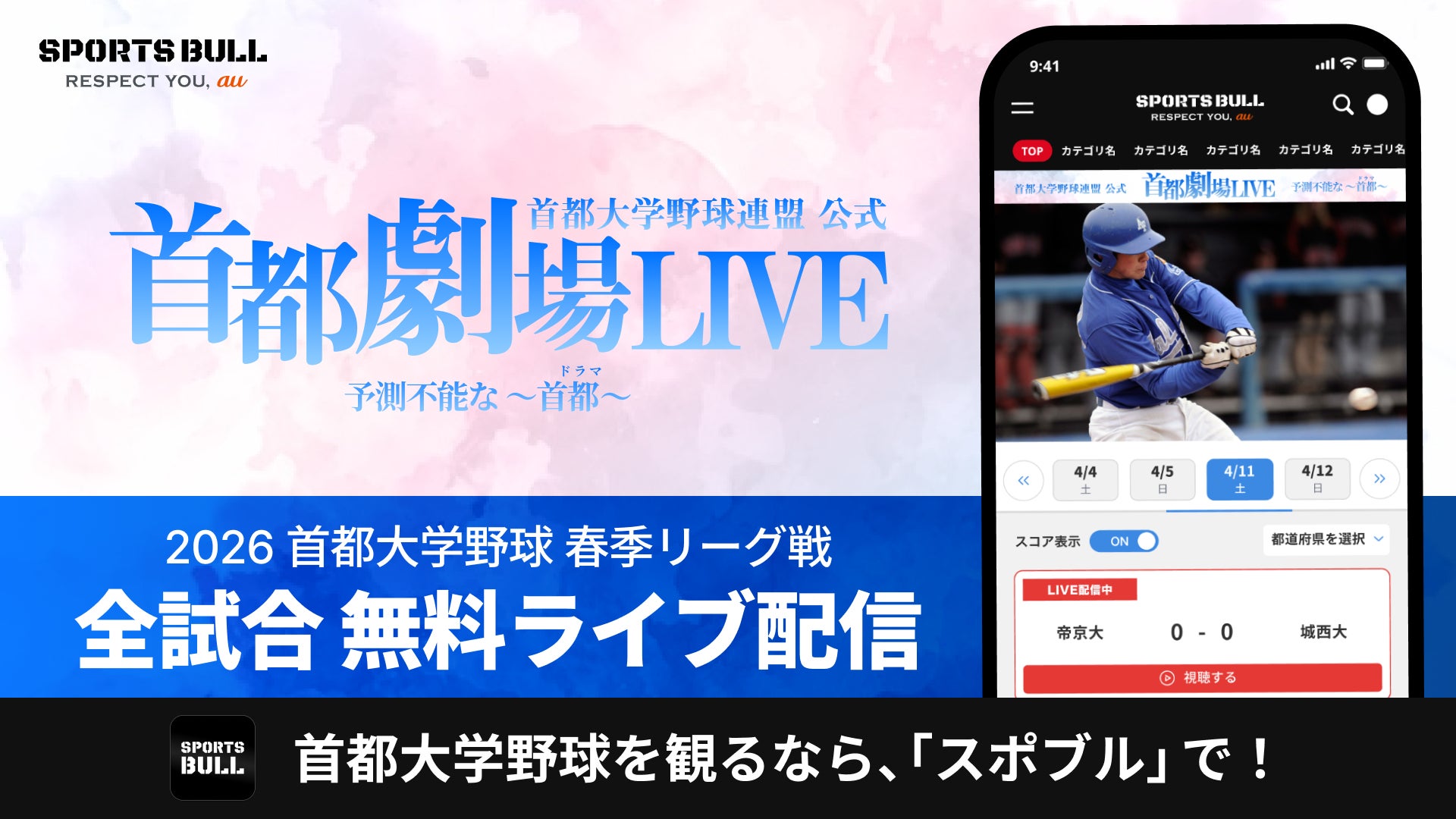 株式会社運動通信社(本社:東京都港区、代表取締役社長 CEO:若村 祐介、以下 運動通信社)、およびKDDI株式会社(所在地:東京都港区、代表取締役社長 CEO:松田 浩路、以下 KDDI)は、運動通信社とKDDIが共同で運営するスポーツメディア「SPORTS BULL(スポーツブル)」内の特設ページ「首都劇場LIVE」(URL:https://sportsbull.jp/live/syuto/)にて、