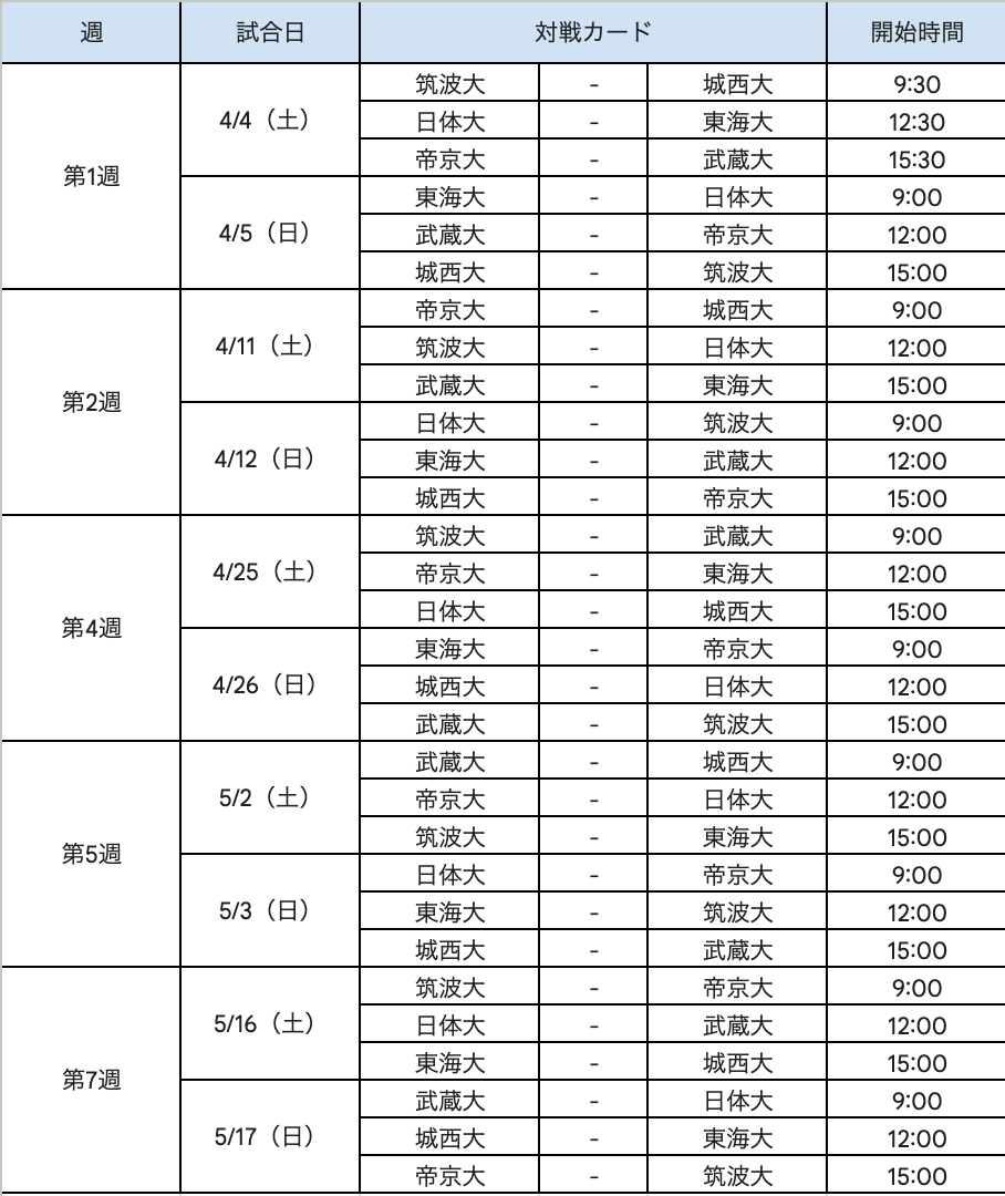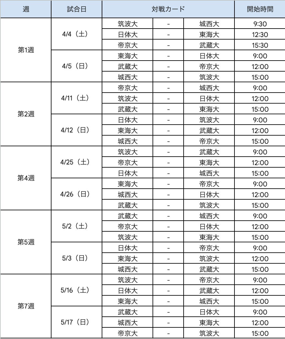 加盟16大学(東海大学、武蔵大学、日本体育大学、帝京大学、桜美林大学、筑波大学、獨協大学、日本ウェルネススポーツ大学、明治学院大学、大東文化大学、東京経済大学、玉川大学、城西大学、明星大学、足利大学、成城大学)を2部制に分け、春季リーグ戦及び秋季リーグ戦を行い、各部リーグ戦績により入替戦を行っています。