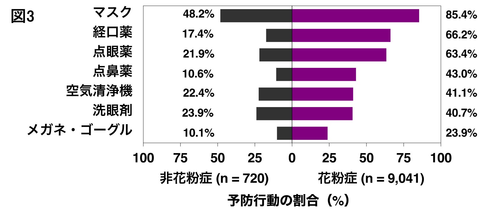 花粉症に対する予防行動を行う割合は、マスクの使用が最も多く、次いで内服薬、点眼薬、点鼻薬、空気清浄機、洗顔剤の使用、メガネ・ゴーグル着用の順で多くなっていました(図3)。