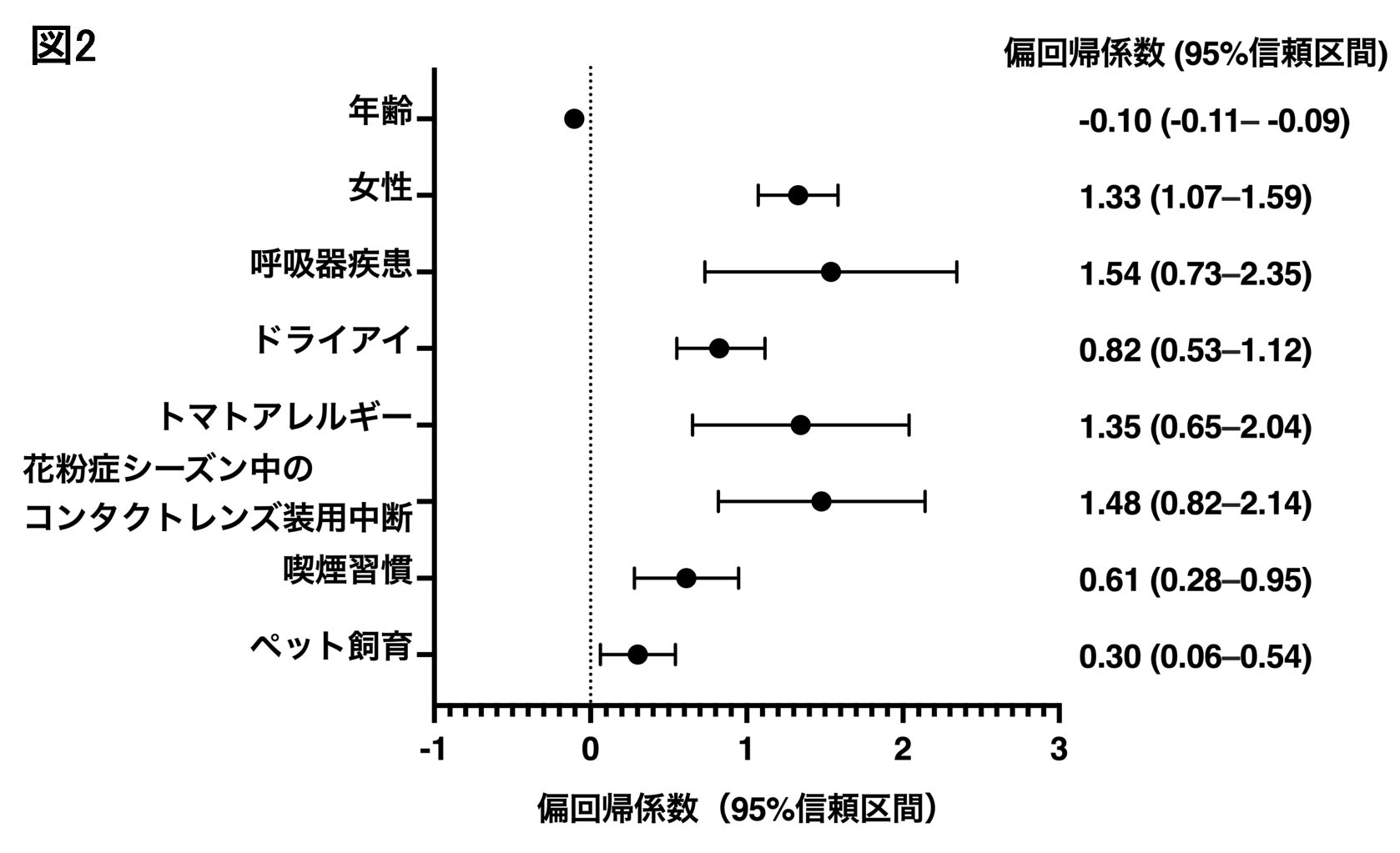 花粉症症状の強さと関連する特徴を検証した結果、「若年・女性・呼吸器疾患・ドライアイ・トマトアレルギー・花粉症シーズン中のコンタクトレンズ装用中断*3・喫煙習慣・ペット飼育」が、花粉症の重症度と正の関連を示すことが明らかとなりました(図2)。