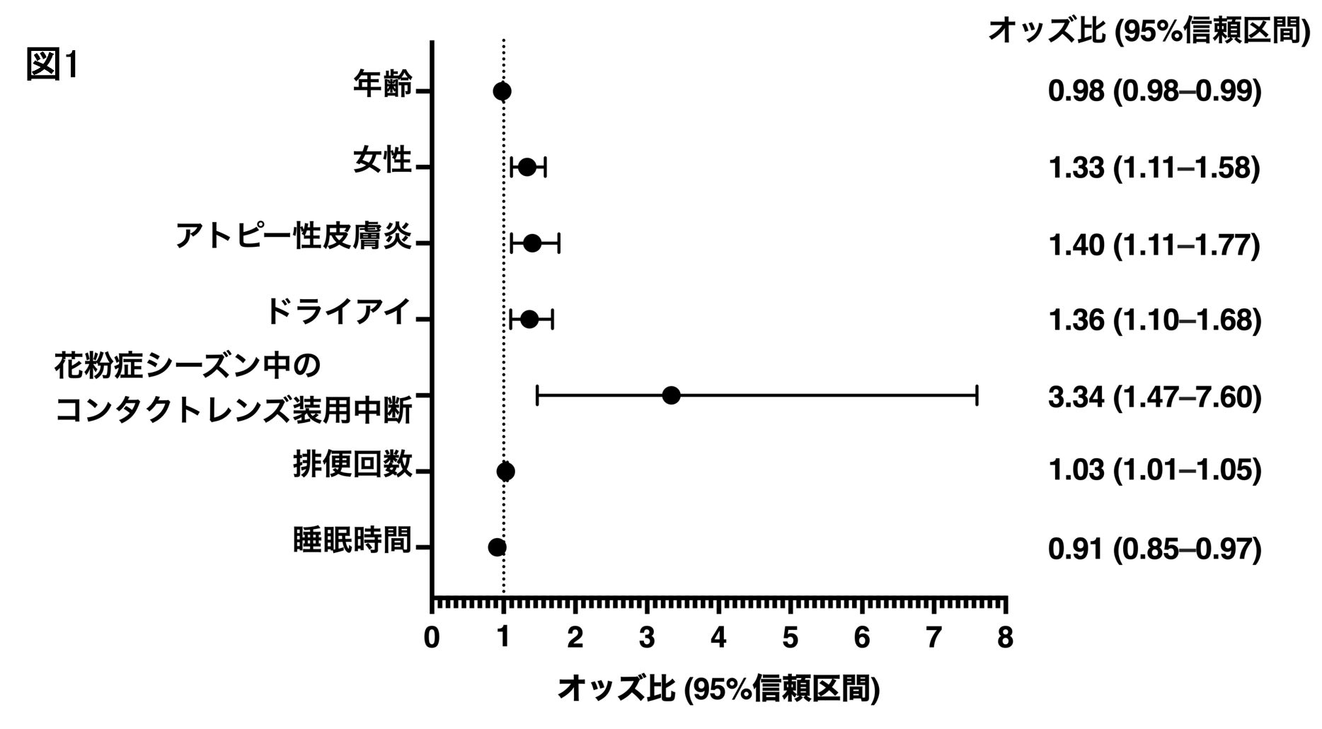 花粉症の人と非花粉症の人を比較した結果、若年齢・女性・アトピー性皮膚炎・ドライアイ・花粉症シーズン中のコンタクトレンズの装用中断*3・排便回数が多いこと・短い睡眠時間が、花粉症のある人の特徴であることが明らかになりました(図1)。