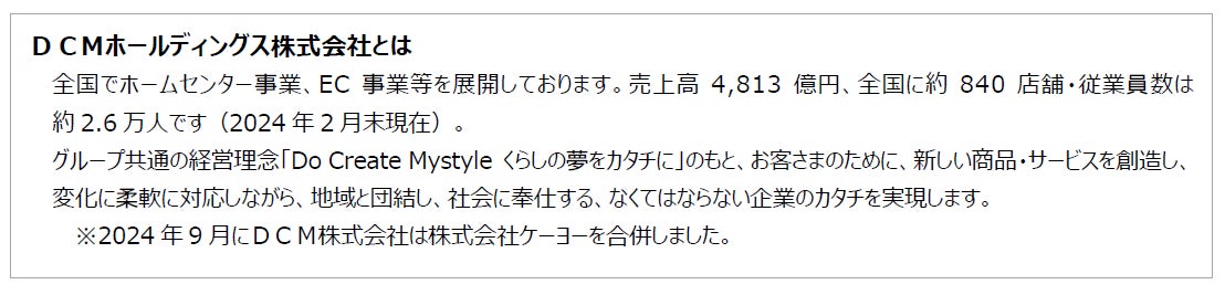 全国でホームセンター事業等を展開するDCMホールディングス株式会社(本社:東京都品川区、代表取締役社長兼COO:石黒靖規)は、連結子会社であるDCMニコット株式会社(本社:北海道札幌市、代表取締役社長:高橋英敏)が運営するホームコンビニ®「DCMニコット山元店」(宮城県亘理郡)を、12月13日(金)にオープンします。