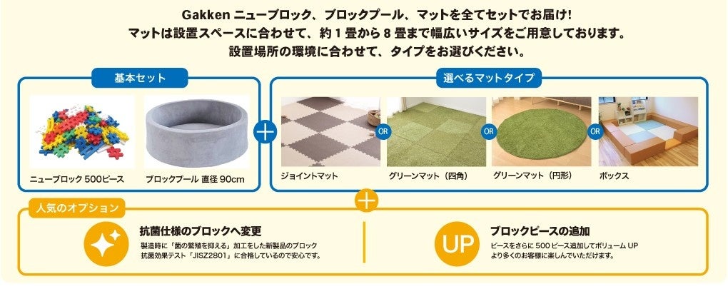 このGakkenニューブロックを使ったキッズスペースレンタルの提供は、「ニューブロック」「ブロックプール」「プレイマット」の3点セットになっており、これだけでキッズスペースを完成させることができます。