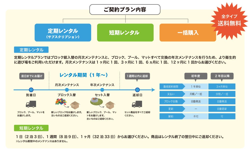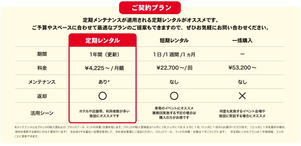 さらに、定期レンタルプランではブロックを新品に交換するメンテナンスサービスを行っているので、衛生面でも安心していただけます。 抗菌仕様のブロックへの変更も可能です。
