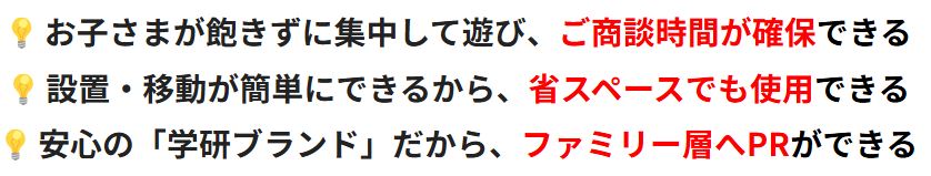 また、Gakkenニューブロックは、パーツが大きいので1.5歳からお使いいただいても誤飲の心配がなく、保護者様にも安心していただけるので、ご商談やくつろぎの場でも滞在時間を確保し、商談等に集中いただけます。