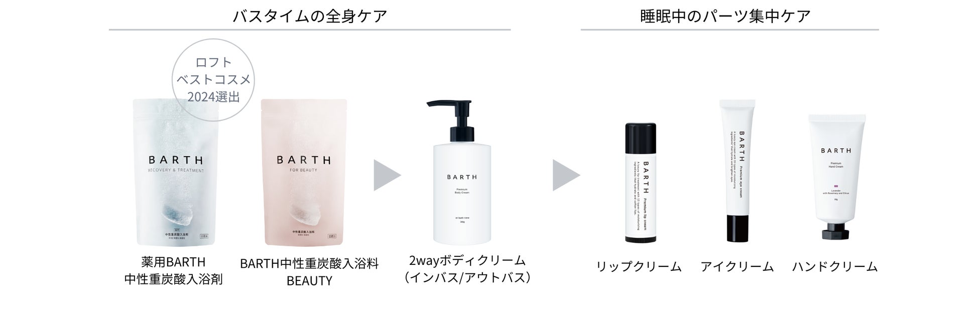 世界でも希少な中性重炭酸泉から着想を得た「薬用BARTH中性重炭酸入浴剤」をはじめとして、ナイトタイムを充実させるプロダクトを展開。“入浴”や“睡眠”といった何気ない日々の暮らしにワンエッセンス加えるだけで満たされる、プレミアムなナイトケア体験を提供します。