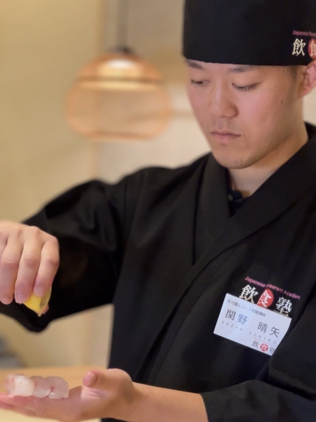 今回のイベントで講師を務めるのは、寿司職人コース専任講師、関野晴矢氏。18歳で寿司業界に入り、22歳の時に出張寿司にて独立。自身で経営するとともに、他店にて伝統的な江戸前寿司を学び、日々研鑽を重ねてきました。また、お客様の目の前で握るといった表に立ったときの「魅せる技術」を得意としており、出張寿司として著名人の自宅や大物YouTuberの企画に呼ばれるなど、自身の個性と寿司職人としての技術を養ってきました。