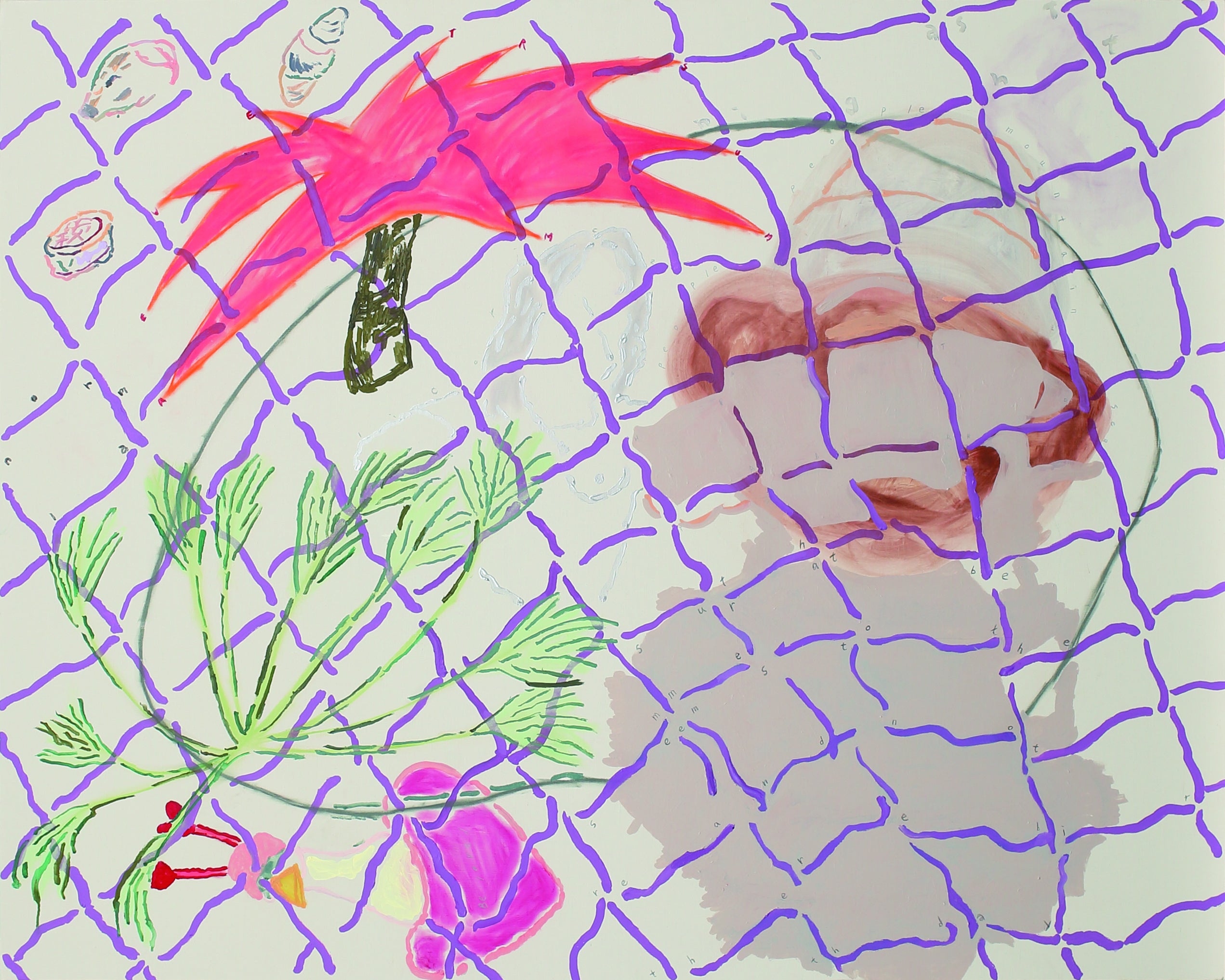 この絵はNY郊外の森を明け方散歩していた時に観た景色になります。その日は陽が高く、緑が濃すぎて私の目には真っ赤に見え、影は長くそこに染み込んだように黒くジワッと刻みこまれていました。日本に帰って来てから、あの時の自然の中の不自然さや感じた違和感を絵にしたいと思い、写真やドローイングをもとに描き始め、跳ねたり飛んだ絵の具の滲みなどコントロールできない部分はそのままに一気に描き上げたこの絵は写真よりもリアルにその時の記憶を現してくれました。