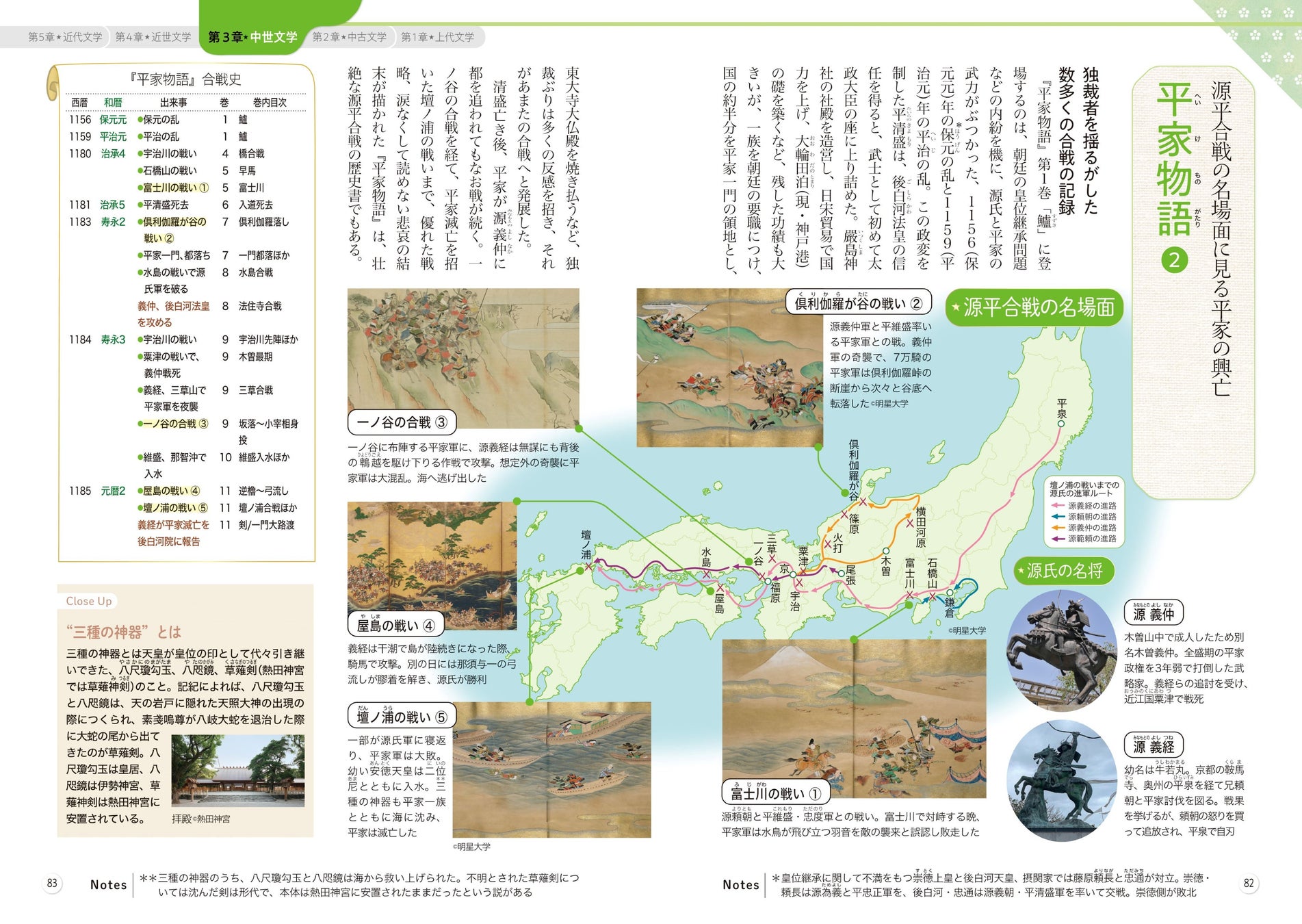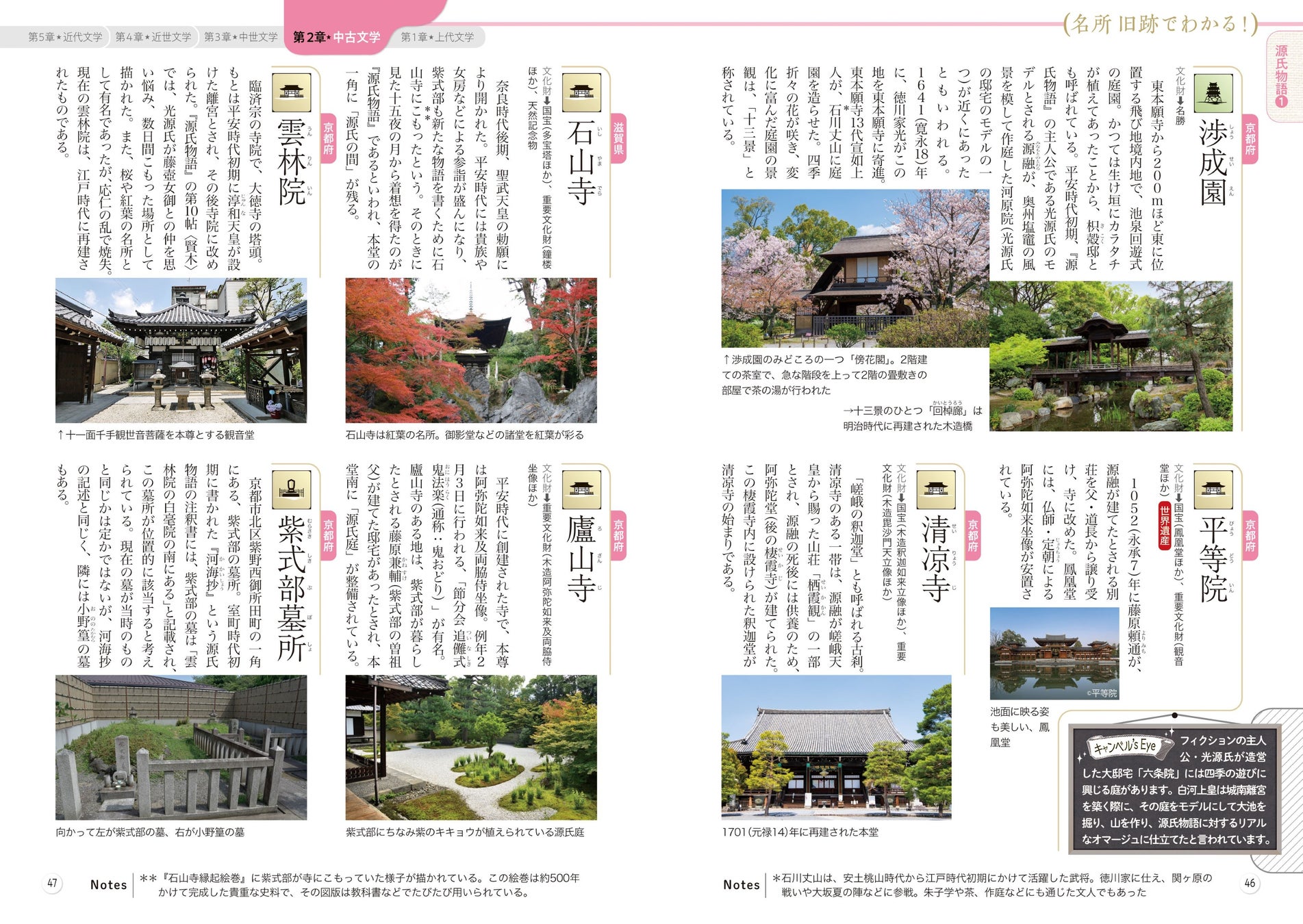 開いたところから読み進められ、作品・作家ごとにさっと知識を得られるテーマ解説のあとは、読んだテーマをさらにぐぐっと実感できる、ゆかりの名所旧跡を紹介するページが続きます。『平家物語』に描かれた源平合戦の舞台、『おくの細道』では松尾芭蕉がたどったみちのくの歌枕、川端康成が逗留した伊豆……、作中に登場する日本の名所旧跡を豊富な写真とともに案内。まるで旅行ガイドを読むように、その地と文学への想像も広がります。