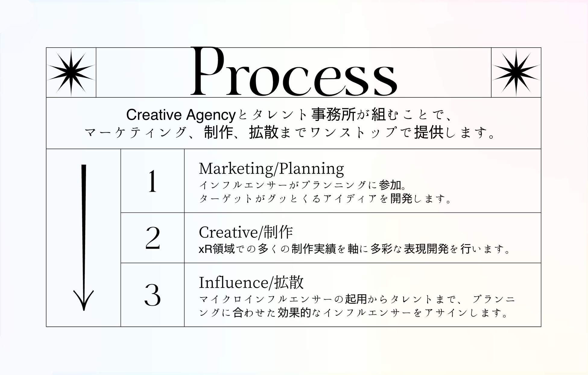 エフェクト単体だけだと起爆力に欠ける懸念を、インフルエンサーをエフェクト開発の初期段階から巻き込む事で、ターゲットの”好き”にマッチするエフェクトを開発し、さらにインフルエンサーから拡散させることができます。