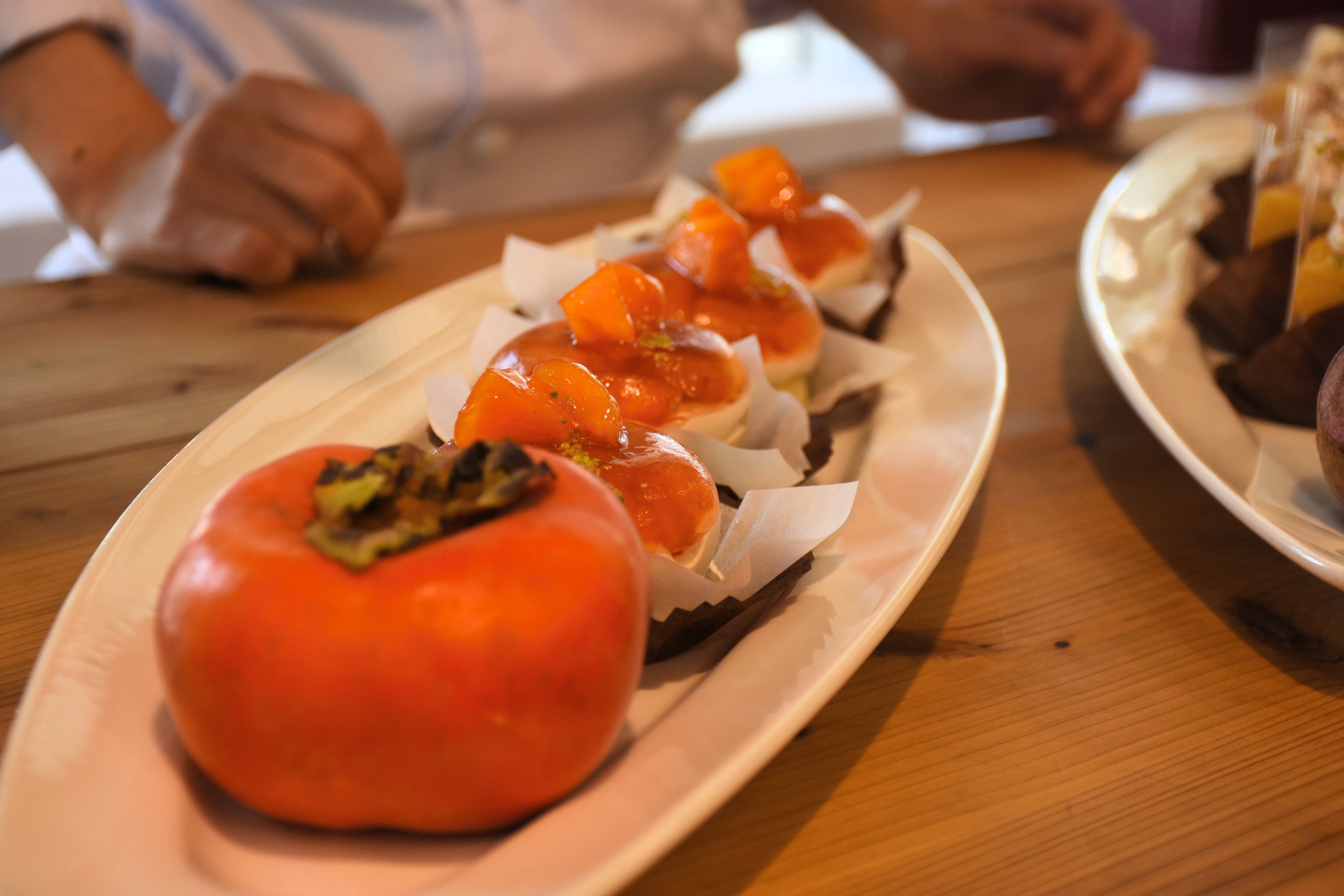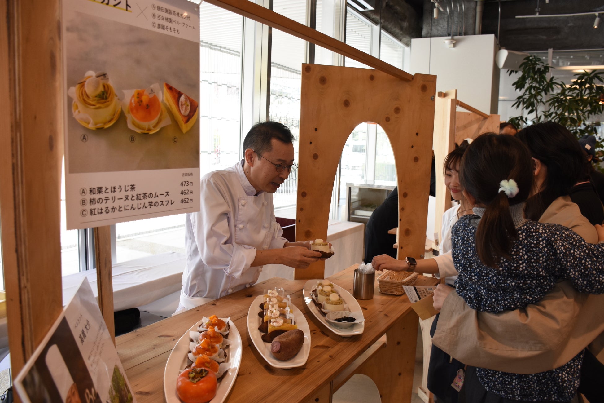 スイーツも充実。地元産の次郎柿、サツマイモ、ほうじ茶を使って3種類のケーキを作った洋菓子店「ベルカント」(西幸町)のケーキを試食した来場者は、「次郎柿が洋菓子になっているのは珍しいし、おいしいです」と、顔をほころばせながら食べていました。