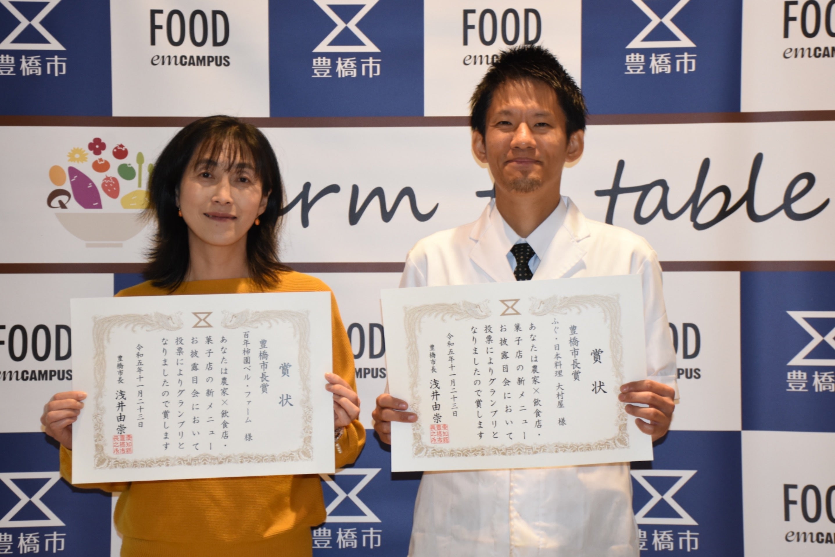表彰式で、大村屋は「地元の食材を使って、食で豊橋をより良くするのがお店のテーマ、会社の理念です。飲食店は農作物がないと成り立たない商売。素晴らしい生産物を提供してくださり、改めて感謝を申し上げたいと思います」、百年柿園ベル・ファームは「グランプリは一生懸命に熱意を持って作ってくださった大村屋さん、皆さんのおかげだと思います。豊橋では柿はもらうものとか、道端ですごく安く売っているものというイメージで、こうして素敵な料理やお菓子にしていただき、嬉しかったです」と感謝しました。