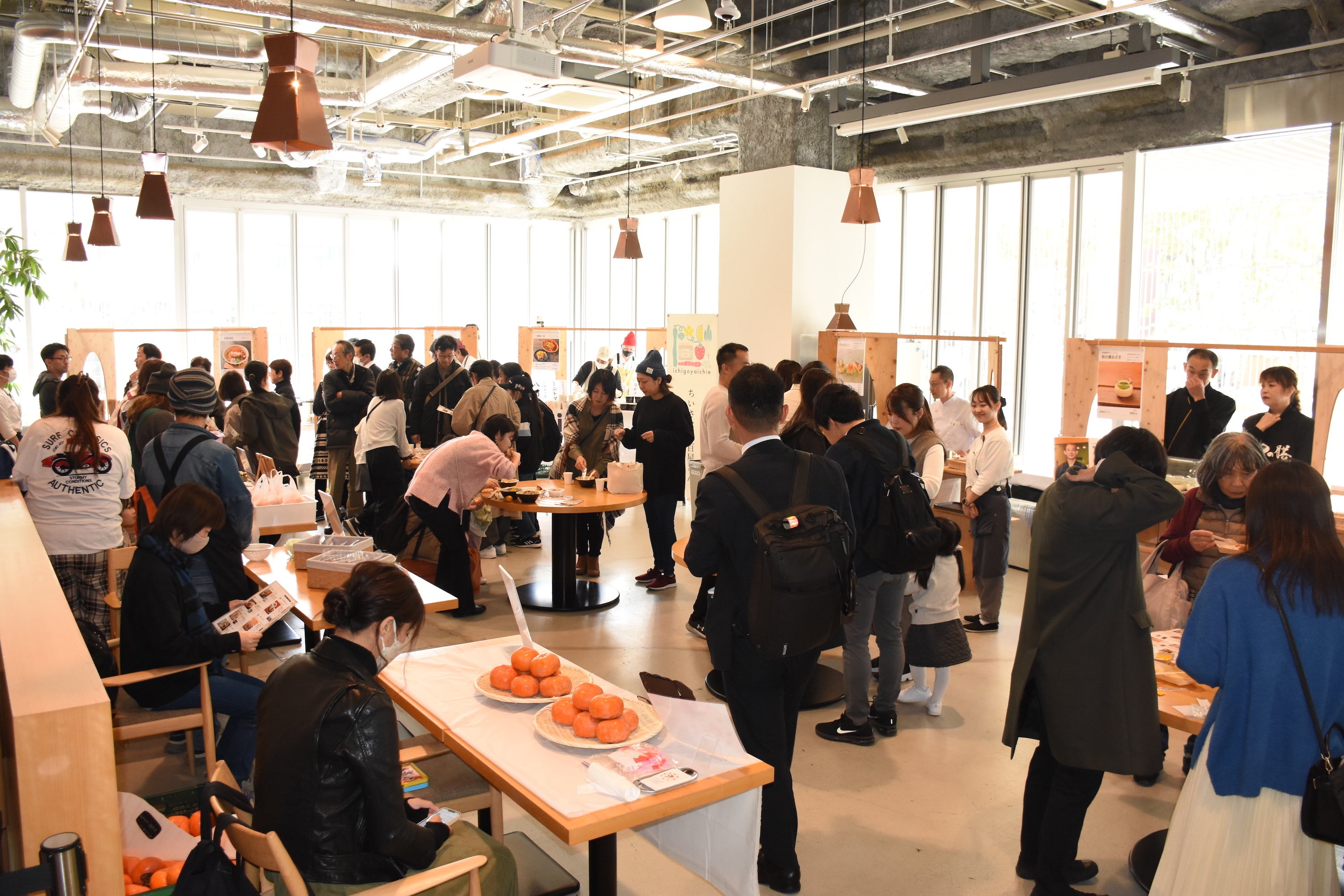 イベントでは、来場者が一番気に入った飲食店、菓子店へ投票も行いました。その結果、グランプリの市長賞には、「ベル・ファームさんの次郎柿と百合根の饅頭」を開発した「ふぐ・日本料理 大村屋」(大橋通1)と「百年柿園ベル・ファーム」が輝きました。このメニューは、次郎柿の食感と甘味を生かすため、生とパリパリ食感のチップ、完熟した柿のジャムを使用。百合根のペーストに米粉を混ぜて柿ジャムを包んだ饅頭に、出汁をベースにしたあんかけを合わせた一品です。169票中36票を獲得しました。