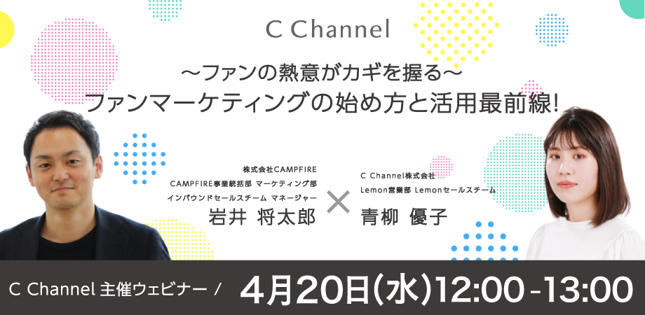 企業とファンフルエンサー(※1)が出会い、関係を深めることができるプラットフォーム「Lemon Square(レモンスクエア)」 (https://lemon.cchan.tv/)を運営するC Channel株式会社(本社:東京都目黒区、代表取締役社長:森川 亮、以下「当社」) は、国内最大のクラウドファンディング「CAMPFIRE」( https://campfire.co.jp/ )を運営する株式会社CAMPFIRE(本社:東京都渋谷区 /代表取締役:家入 一真 / 以下、CAMPFIRE )とオンラインウェビナーを実施いたします。