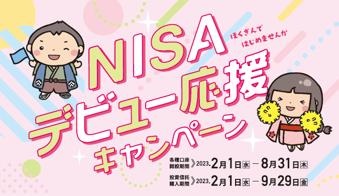 ほくほくフィナンシャルグループの北陸銀行(頭取 中澤 宏)および北海道銀行(頭取 兼間 祐二)は、2023年2月より「NISAキャンペーン」を実施しておりますのでお知らせいたします。