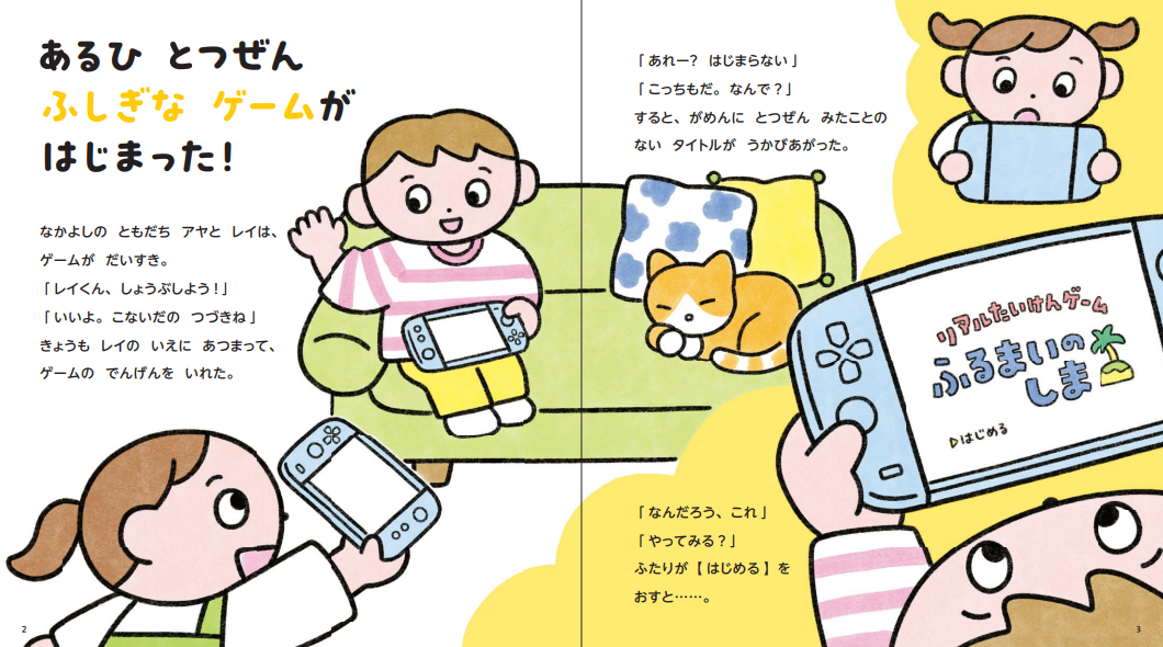 お話は、仲よしの友だちレイとアヤが、〈ふるまいのしま〉というゲームの世界に入り込むところから始まります。