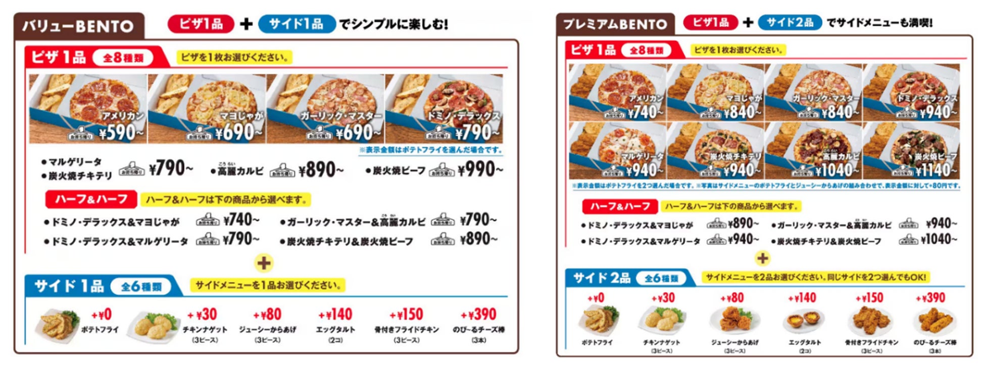 「ピザBENTO(ベントウ)」は、販売累計620万食(2024年7月11日時点)を突破した大人気商品「マイドミノ」を、食べきりサイズにこだわった“ちょうどいい”コンパクトサイズに2024年7月22日にリニューアルした新商品です。お腹の空き具合によって自由に選べるよう、ピザにお好きなサイドメニューが1品選べる「バリューBENTO」と、お好きなサイドメニューが2品選べる「プレミアムBENTO」の2カテゴリーで、お持ち帰り590円~/デリバリー890円~と、おトクな価格で販売しています。