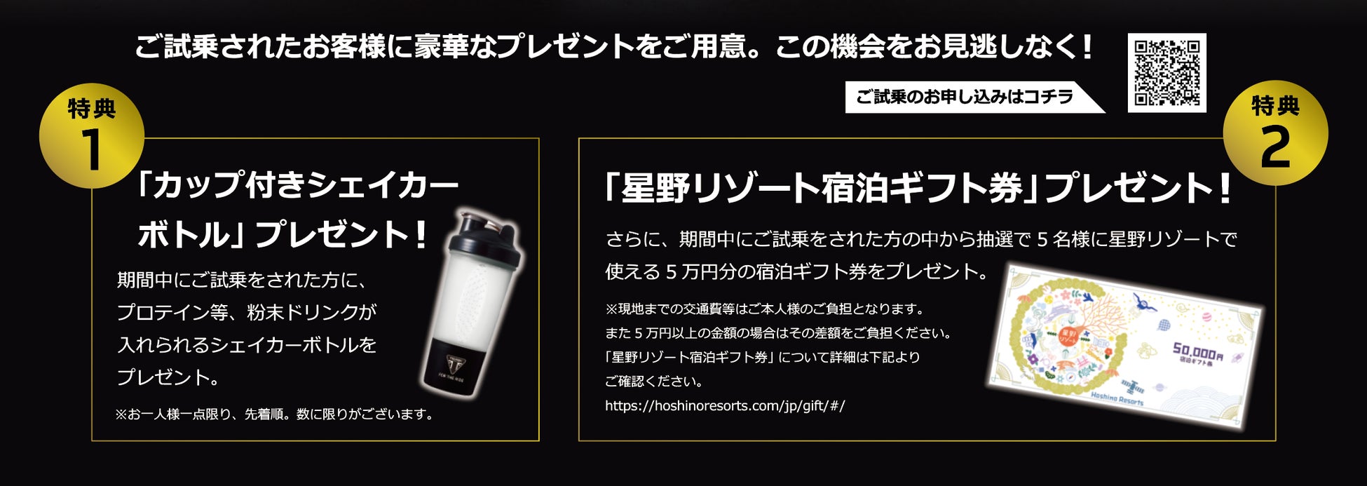期間中、トライアンフ正規販売店にてご試乗をされた方の中から「抽選で5名様」に、全国の星野リゾートで使用可能な【5万円分の宿泊ギフト券】をプレゼント!