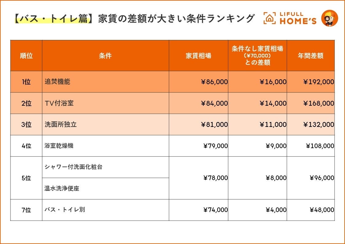 【バス・トイレ篇】家賃の差額が大きい条件ランキング: 1位は「追焚機能」で年間約20万円の差額。