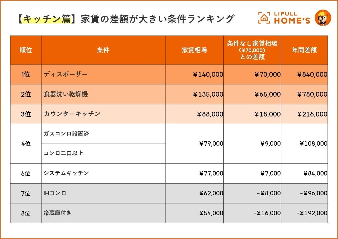 【キッチン篇】家賃の差額が大きい条件ランキング:1位は「ディスポーザー」、年間で84万円の差額に。