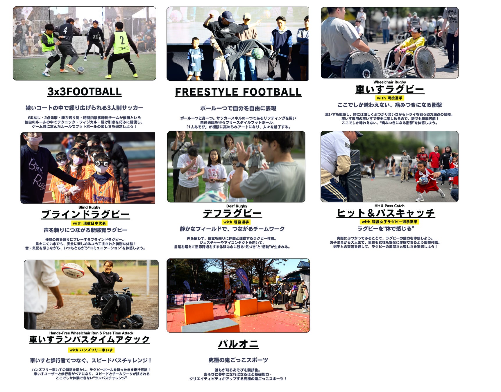 本イベントは、フットボール(サッカー・ラグビー)を中心に、多様なプレースタイルを一堂に集め、誰もが自由に“体を動かすことの楽しさ”と“多様性の価値”を感じられる体験型のイベントになります。