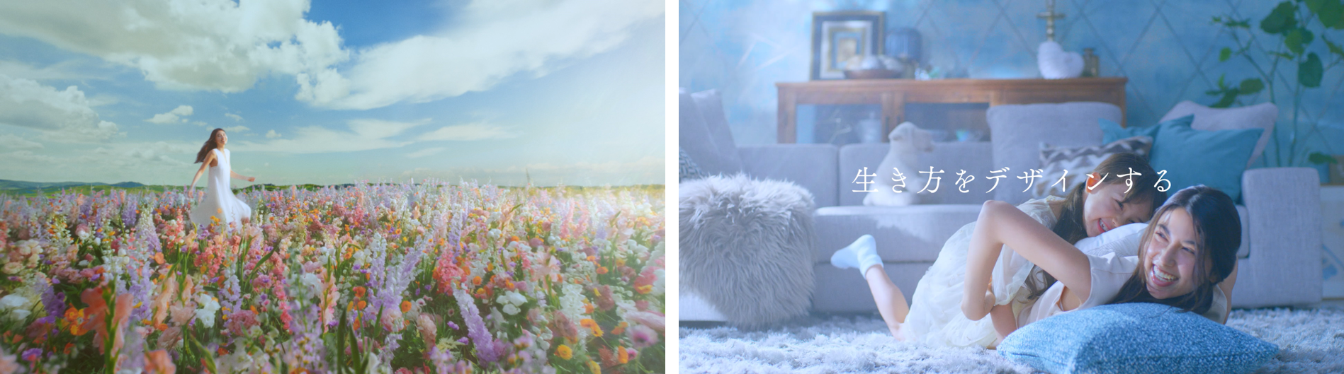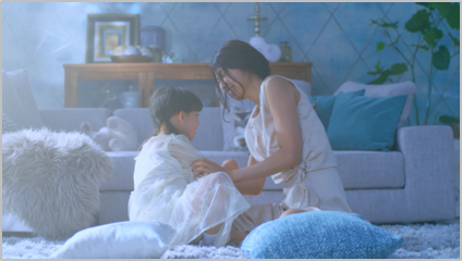 企画内容:LEBENに住まう幸せをドラマティックに表現するため、勢いよくベッドに飛び込む女性のシーンから物語は始まります。今にもベッドに沈み込みそうになったところで、物語の舞台は花畑の世界に切り替わり、女性の満ち足りた気分を象徴する美しく気持ちの良い世界へ。続いて、いくつかのその世界を堪能する女性の印象的な姿が描かれます。そして、次の瞬間、ふいに誰かに声をかけられたかのように振り返る女性。その振り返りシーンをキッカケに、舞台はLEBENに戻ります。どうやら、現実の世界で、女性はシャワーを終えた自分の娘から、ふいに声をかけられた模様。やんちゃな娘の髪をタオルで拭く、ほほえましい母親と娘のシーンが描かれます。最後、母娘が転げまわってふざけ合う姿が・・それは、まさにLEBENでの幸せの生活の象徴です。