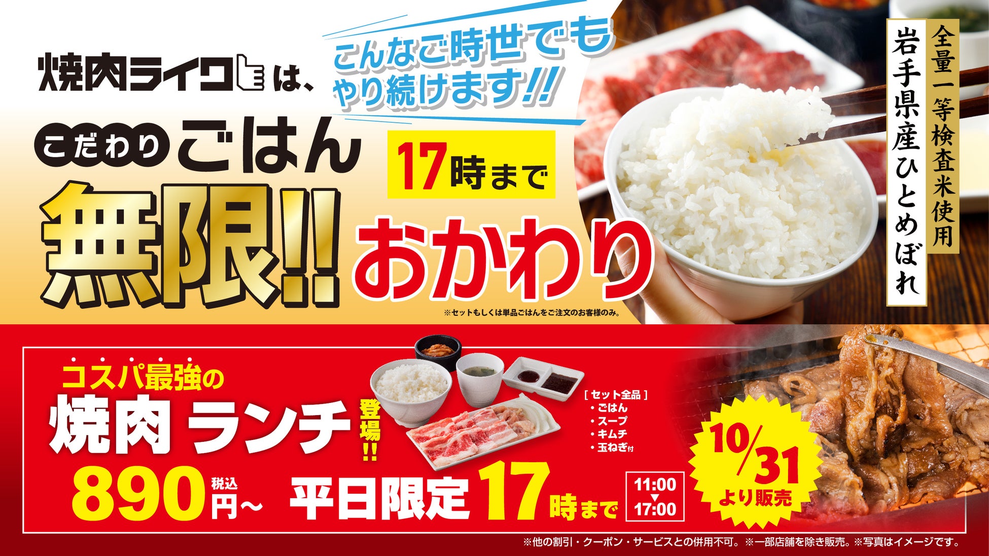 【無限おかわり継続&お得なランチが新登場!】食べ応えあるお肉3種と、おかわり自由のごはんで大満足!平日17時までの限定セットが、なんと890円で楽しめます!10月31日(木)から焼肉ライクで販売開始!