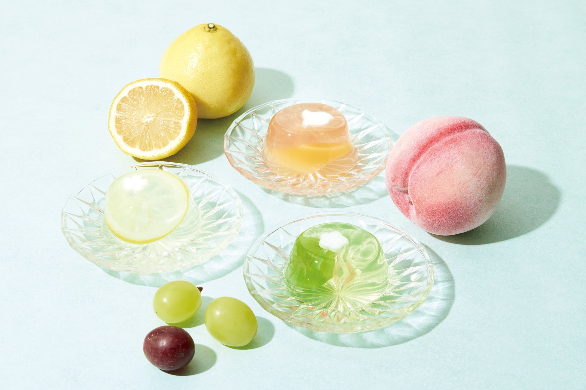 日向夏やレモン、桃、ぶどうなどの果物をテーマにした3種のゼリー。