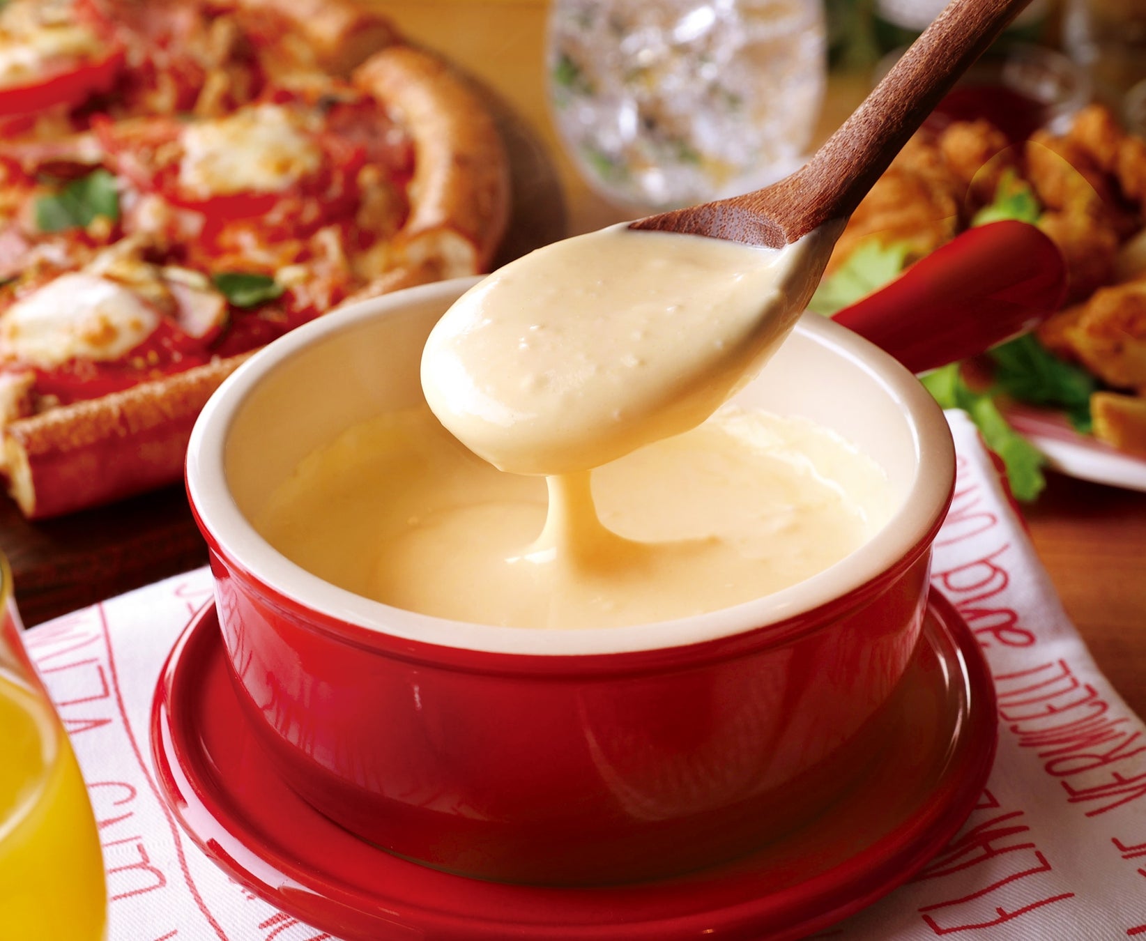 「激盛りトマチーピザ」に別添でついてくる「とろ~りチーズ」は、チーズ本来のコクと旨みがたっぷり。厳選したナチュラルチーズをオーブンでとろけるように焼き上げた逸品。ピザにかけたり、ピザやサイドメニューなどにつけたり、楽しみ方は自由。とにかくおもいっきりチーズが楽しめる、単品注文も可能な新商品です。