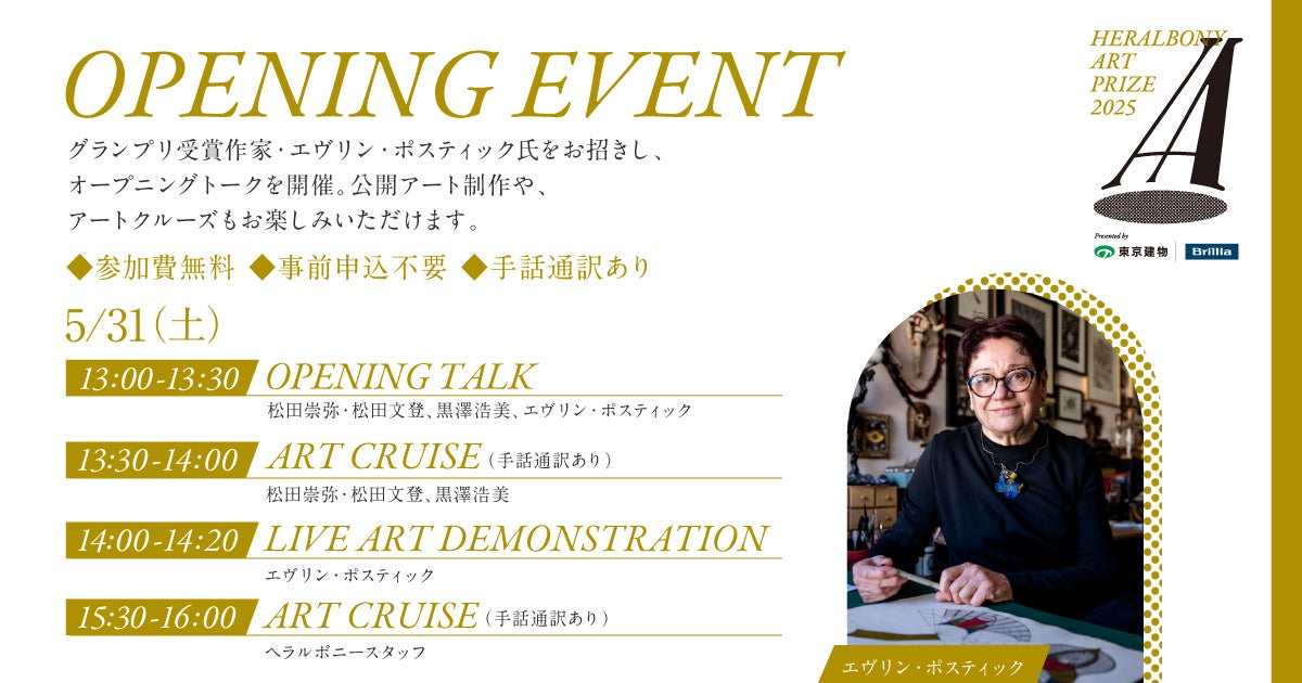 展覧会初日を記念し、オープニングイベントを開催します。グランプリ受賞作家・エヴリン・ポスティック、審査員の黒澤浩美、主催のヘラルボニーCo-CEO 松田崇弥・松田文登がオープニングトークに出演。さらに、エヴリン・ポスティック氏による公開アート制作や、アートクルーズなど、多数イベントをご用意しております。展覧会の幕開けを飾る特別な日に、皆様のご来場を心よりお待ちしています。