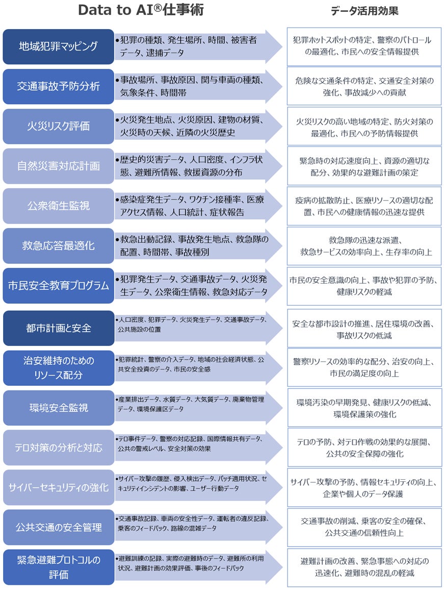 - 使用データ: 犯罪発生データ、交通事故データ、火災発生データ、公衆衛生情報、救急対応データ