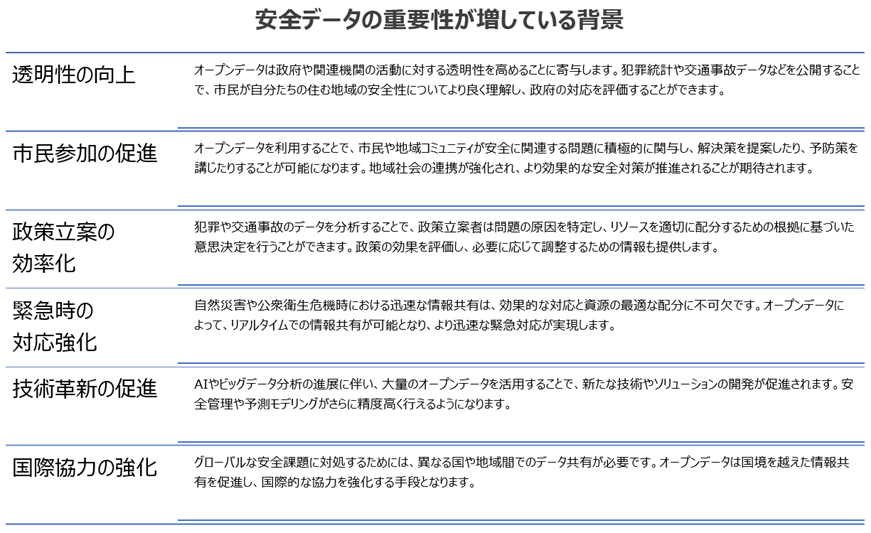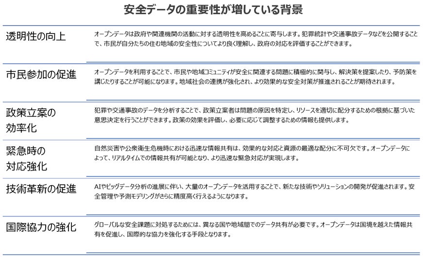 これらの要因により、安全分野におけるオープンデータは、より効果的な治安維持、災害対応、健康リスク管理など、広範な利益をもたらす重要な資源となっています。