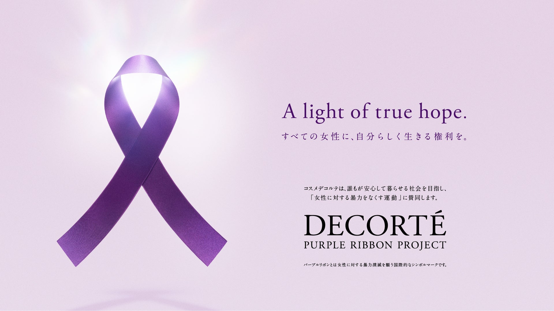 『コスメデコルテ』は、「A light of true hope すべての女性に、自分らしく生きる権利を。」というメッセージを掲げ、すべての女性たちの暮らしと未来を守り、ジェンダーギャップを解消するために、独自の取り組み「DECORTÉ PURPLE RIBBON PROJECT」を立ち上げ、様々な支援を行います。また、内閣府が毎年11月に推進する「女性に対する暴力をなくす運動(※2)」に賛同し、パープルライトアップや寄附など、社会に対する啓発と被害者支援の両面から取り組み、女性に対する暴力のない社会の実現に貢献します。