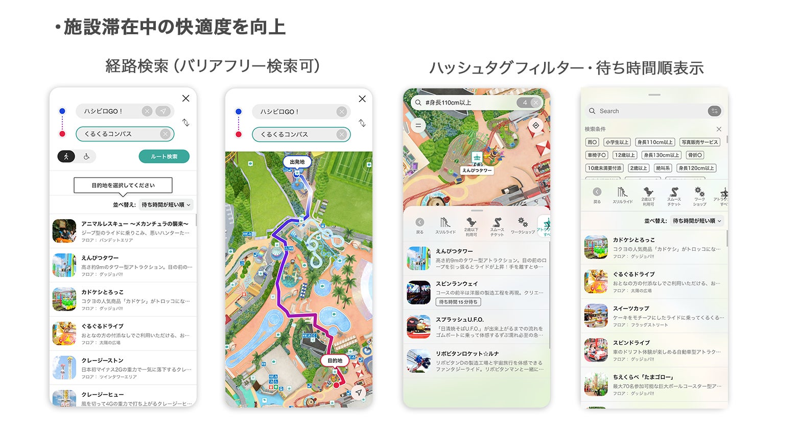 「よみランデジタル集遊マップ」は、複数施設のマップを同時にデジタルマップ化することで、施設間の回遊を促進するとともに、お客様の利便性の向上、紙マップの印刷や廃棄の削減を通してSDGs達成に貢献します。各施設の経路検索や条件検索、アトラクションの待ち時間などの混雑状況が手元のスマートフォンですぐにわかるため、来場者はより快適で効率的に施設内を回れるようになります。また、11言語に対応し、近年来場が増えている訪日外国人の方々もストレスなく利用できます。加えて、最新情報をリアルタイムで更新できるため、頻繁に変動する施設情報を正確に来場者の皆様にお届けできます。