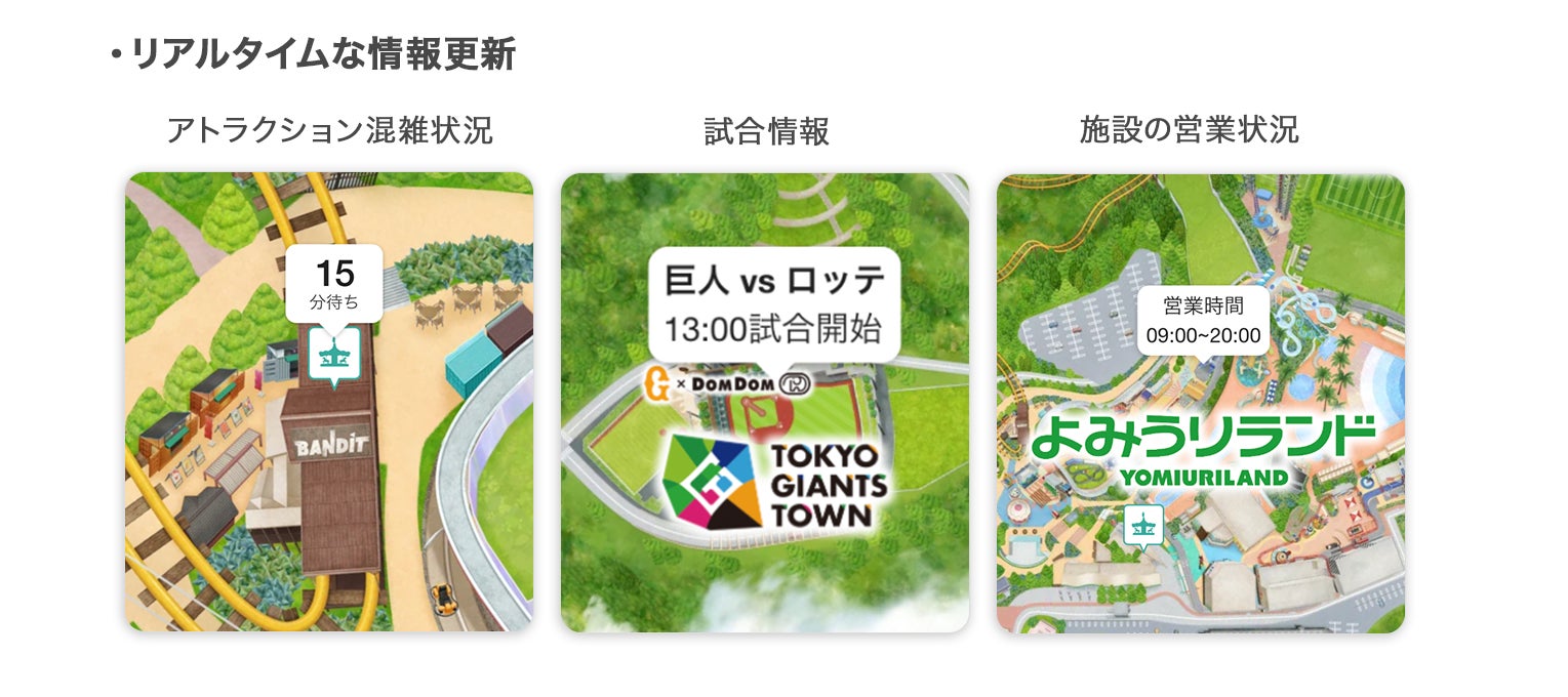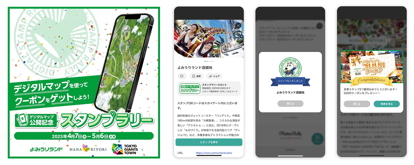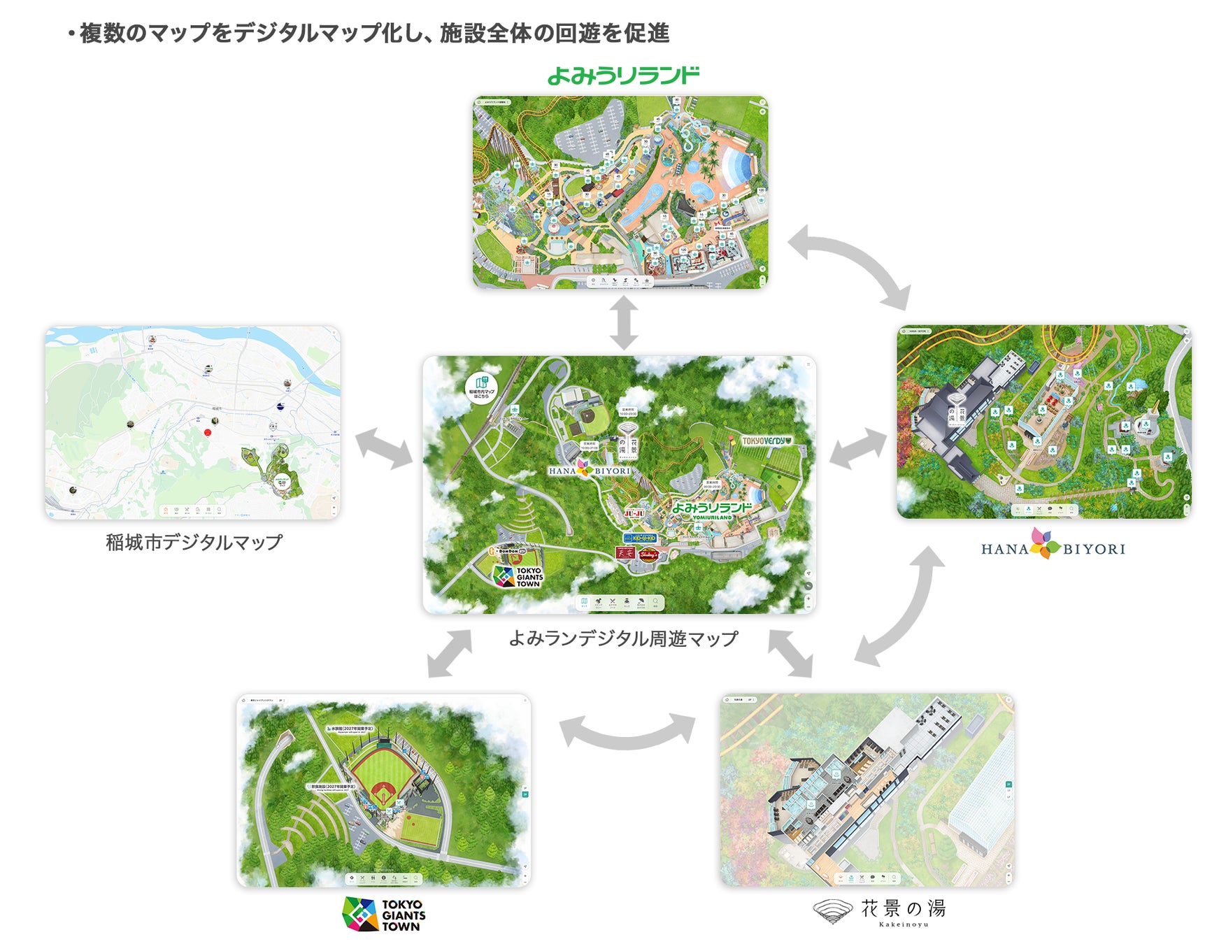 内容:よみうりランド、HANA・BIYORI、よみうりランド眺望温泉 花景の湯(HANA・BIYORI内)、TOKYO GIANTS TOWNの4施設がひとつのデジタルマップで表示できます。