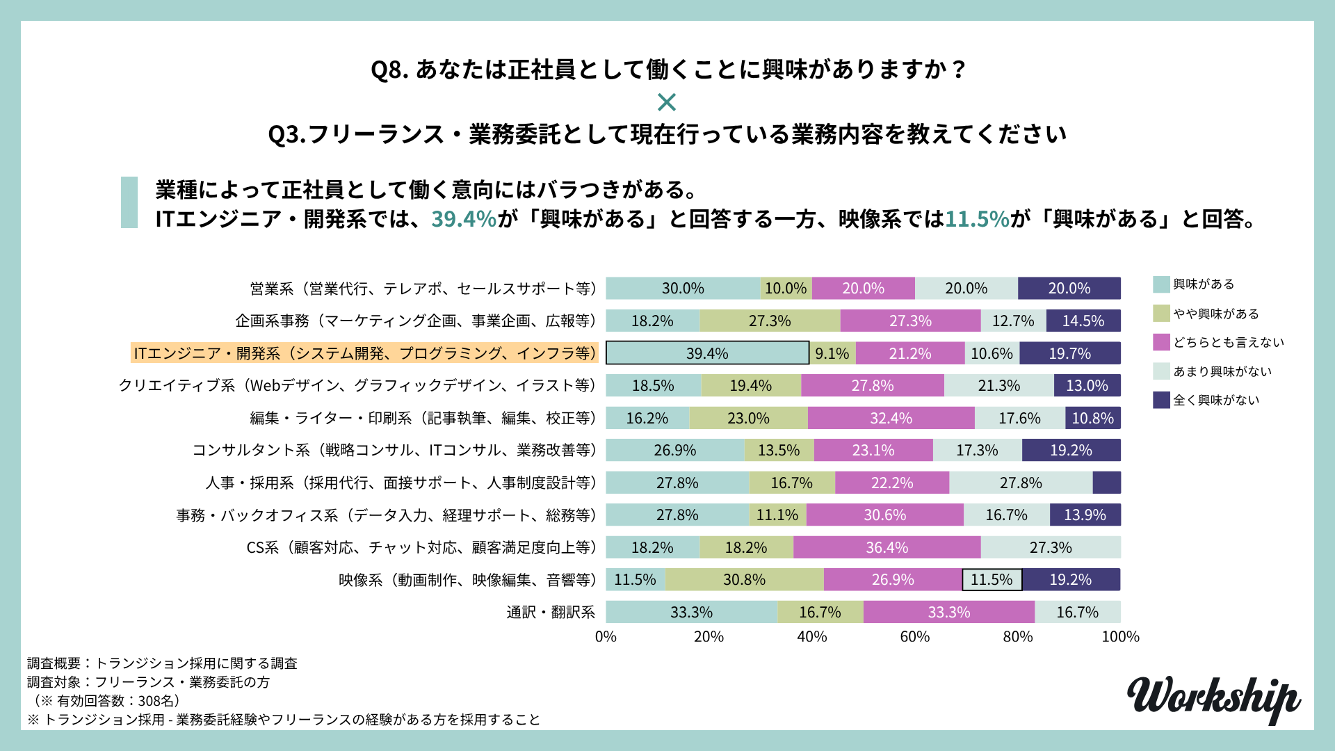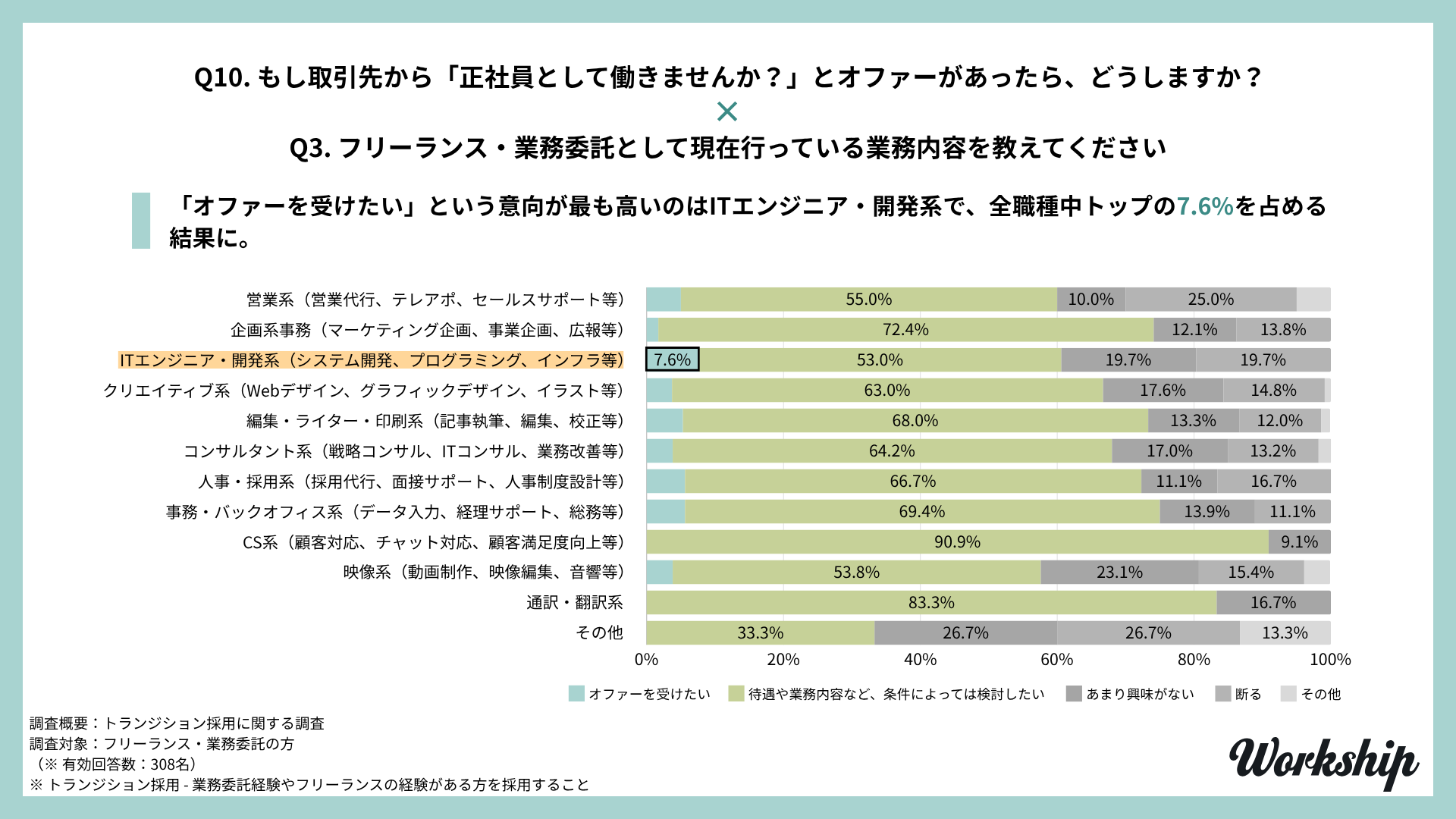 これらの結果は、ITエンジニア層が、企業が提示する条件次第で正社員への移行(トランジション採用)に結びつきやすい人材であることを示しています。