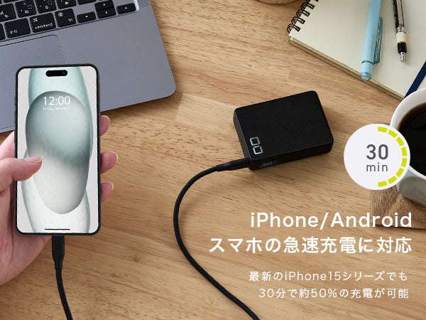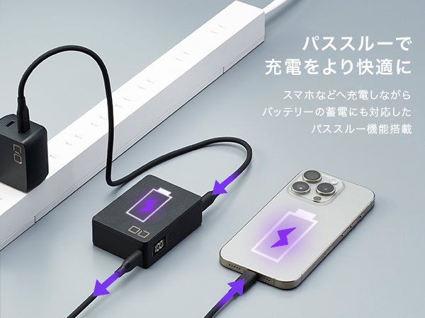 パススルー機能搭載で、バッテリーに充電しながらスマホなどへの充電にも対応しております。