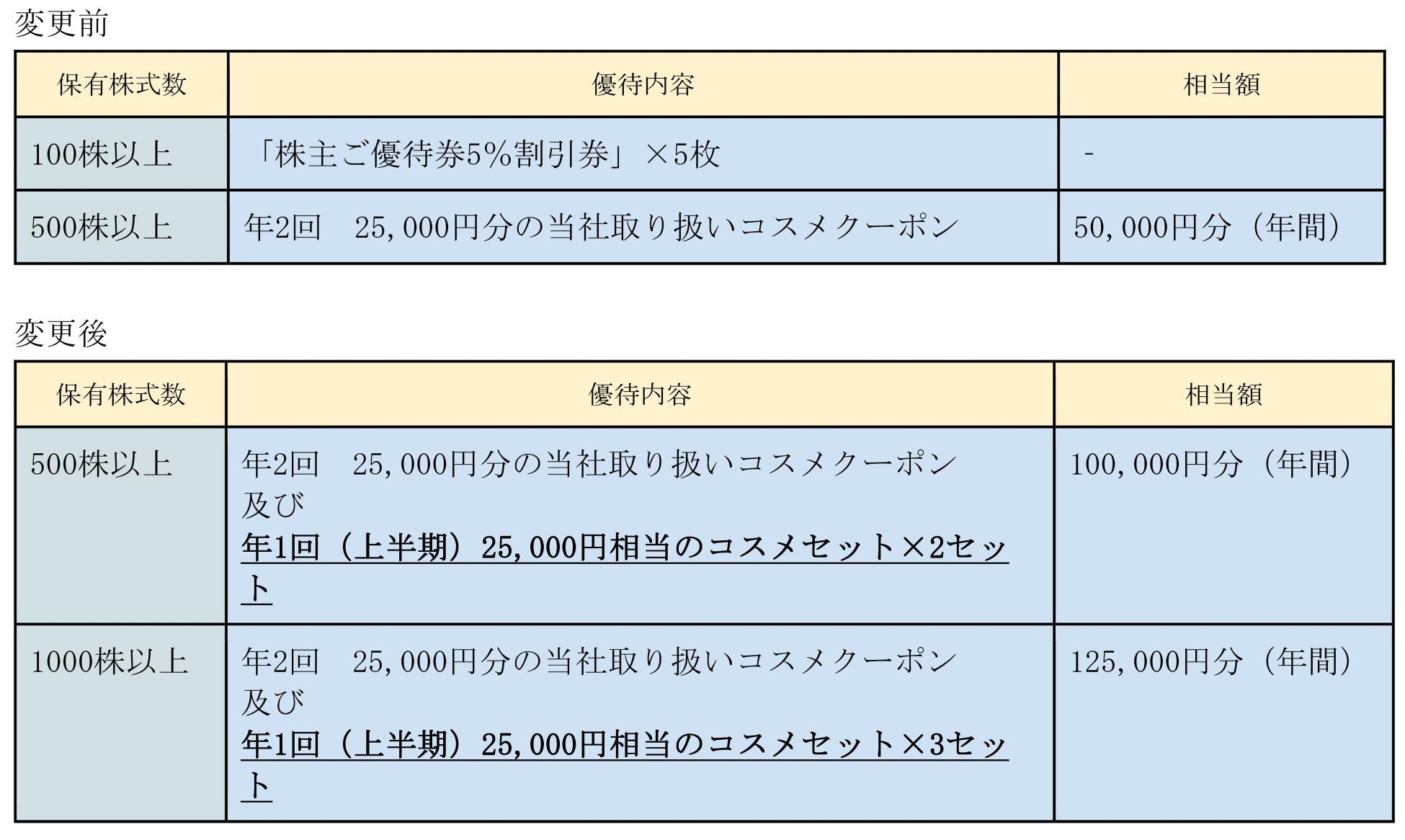 今後、毎年3月20日の株主名簿に記載された株主様のうち500株以上の当社株式を保有する株主様に対しまして、当社が総輸入代理店契約を締結する韓国コスメブランドから従来のクーポンに加えまして、新たに追加の贈答を致します。さらに、1000株以上を保有されている株主様にはより豪華な特典をご用意いたします。尚、「株主ご優待券5%割引券」は廃止させていただきます。