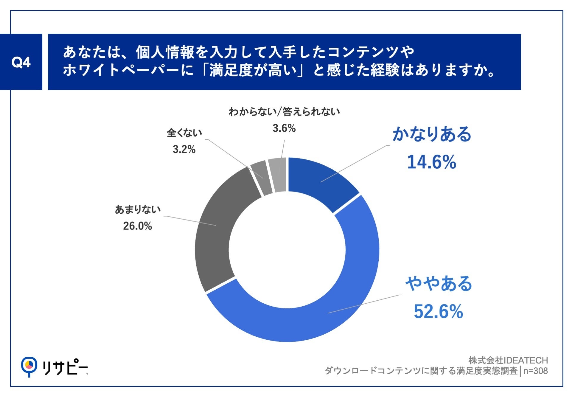「Q4.あなたは、個人情報を入力して入手したコンテンツやホワイトペーパーに「満足度が高い」と感じた経験はありますか。」(n=308)と質問したところ、「かなりある」が14.6%、「ややある」が52.6%という回答となりました。