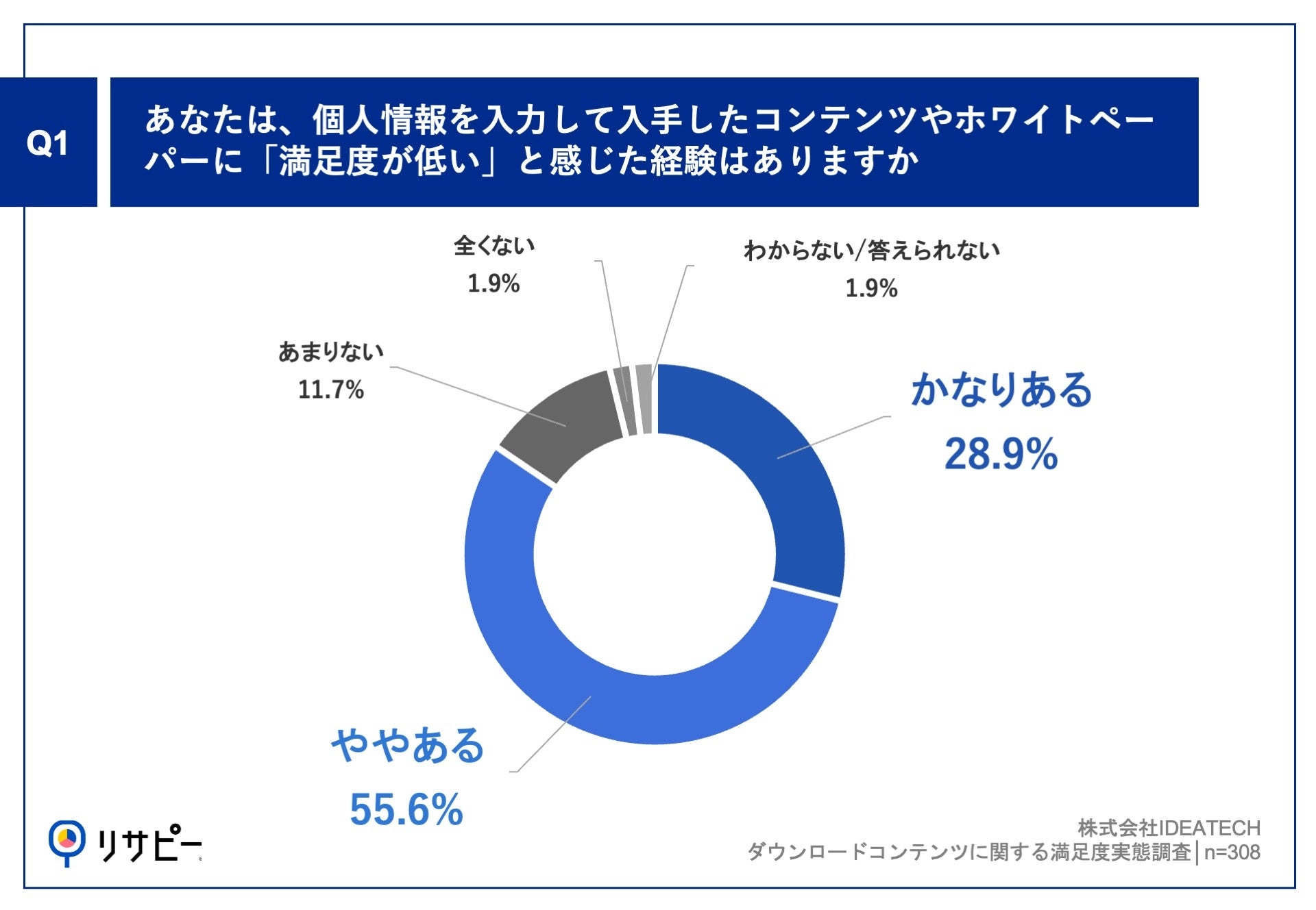 「Q1.あなたは、個人情報を入力して入手したコンテンツやホワイトペーパーに「満足度が低い」と感じた経験はありますか。」(n=308)と質問したところ、「かなりある」が28.9%、「ややある」が55.6%という回答となりました。