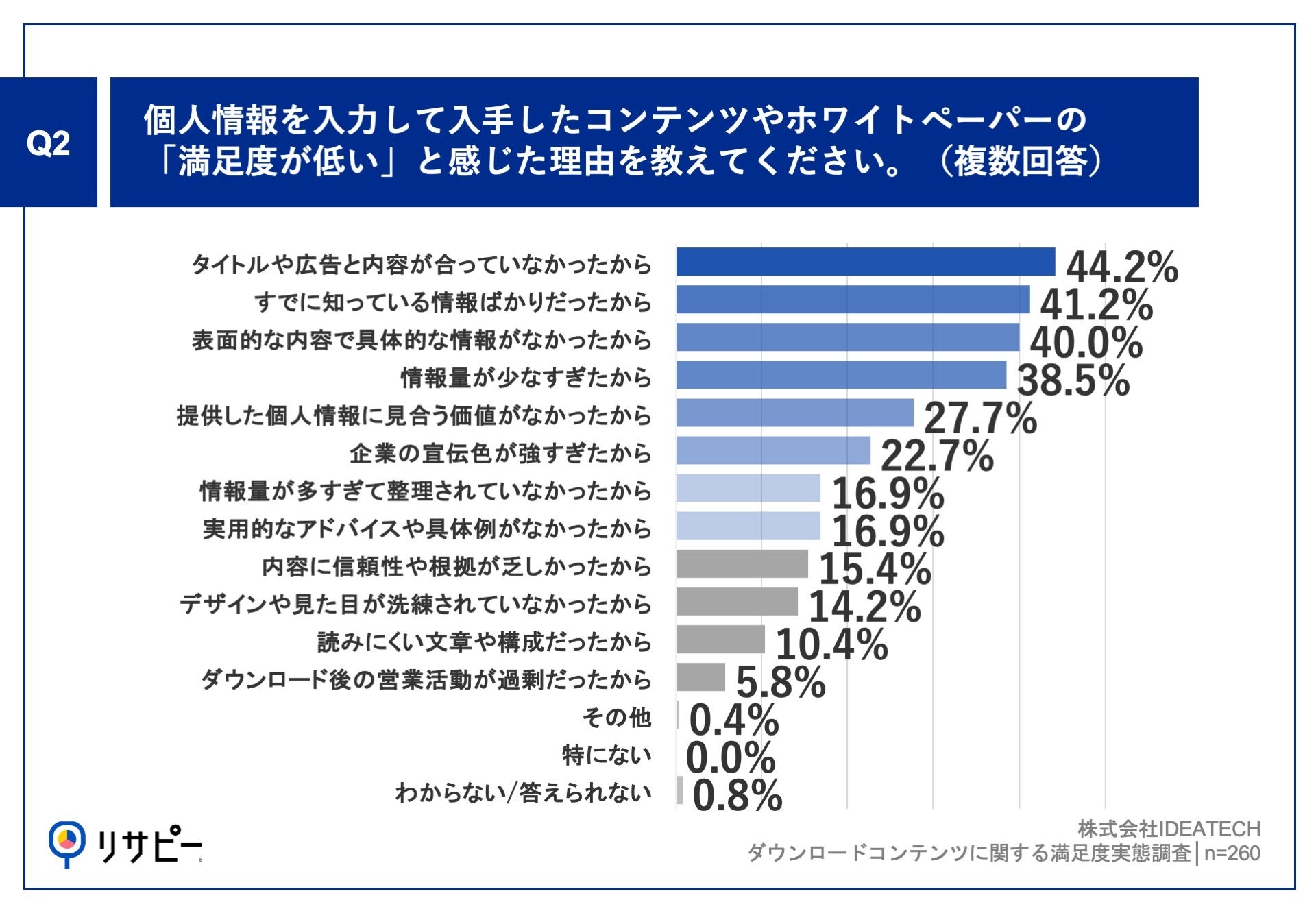 Q1で「かなりある」「ややある」と回答した方に、「Q2.個人情報を入力して入手したコンテンツやホワイトペーパーの「満足度が低い」と感じた理由を教えてください。(複数回答)」(n=260)と質問したところ、「タイトルや広告と内容が合っていなかったから」が44.2%、「すでに知っている情報ばかりだったから」が41.2%、「表面的な内容で具体的な情報がなかったから」が40.0%という回答となりました。