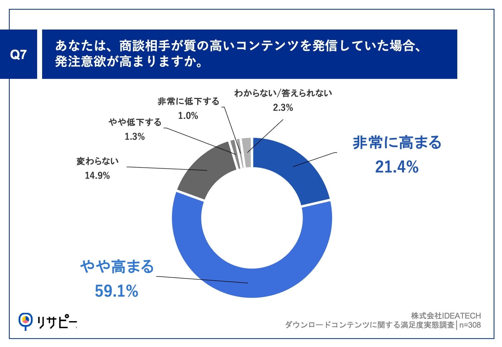 「Q7.あなたは、商談相手が質の高いコンテンツを発信していた場合、発注意欲が高まりますか。」(n=308)と質問したところ、「非常に高まる」が21.4%、「やや高まる」が59.1%という回答となりました。