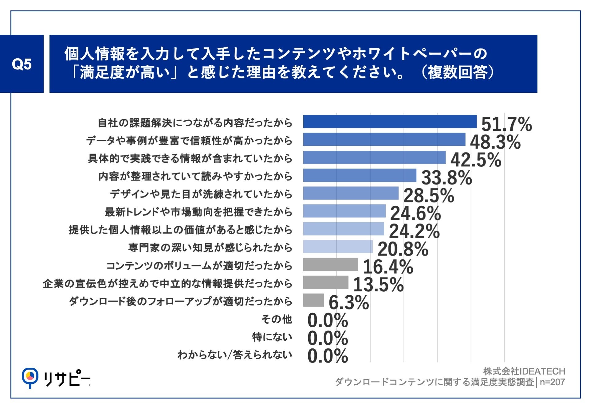 Q4で「かなりある」「ややある」と回答した方に、「Q5.個人情報を入力して入手したコンテンツやホワイトペーパーの「満足度が高い」と感じた理由を教えてください。(複数回答)」(n=207)と質問したところ、「自社の課題解決につながる内容だったから」が51.7%、「データや事例が豊富で信頼性が高かったから」が48.3%、「具体的で実践できる情報が含まれていたから」が42.5%という回答となりました。