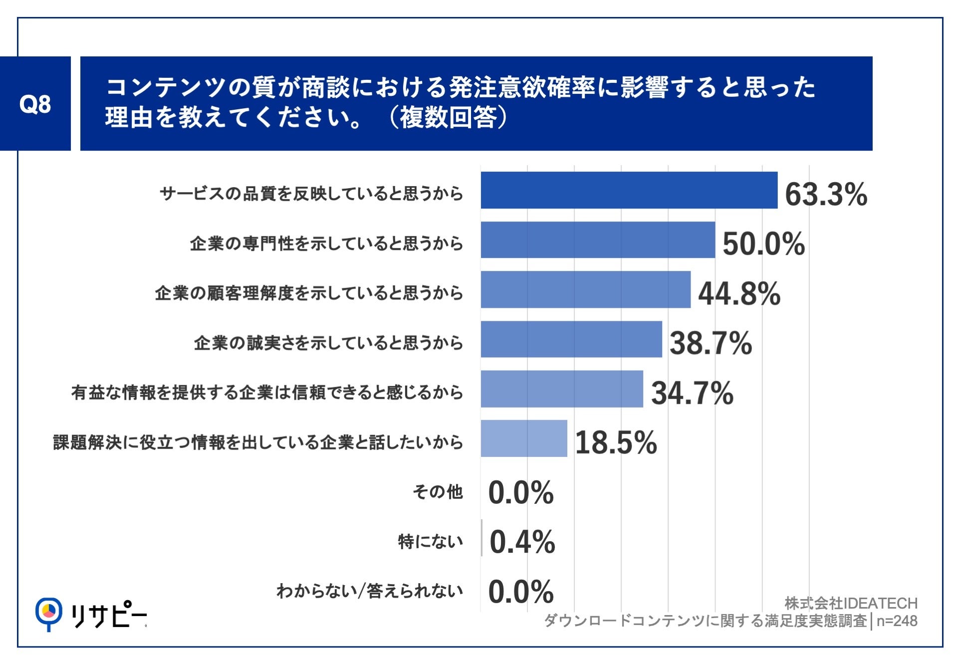Q7で「非常に高まる」「やや高まる」と回答した方に、「Q8.コンテンツの質が商談における発注意欲確率に影響すると思った理由を教えてください。(複数回答)」(n=248)と質問したところ、「サービスの品質を反映していると思うから」が63.3%、「企業の専門性を示していると思うから」が50.0%、「企業の顧客理解度を示していると思うから」が44.8%という回答となりました。