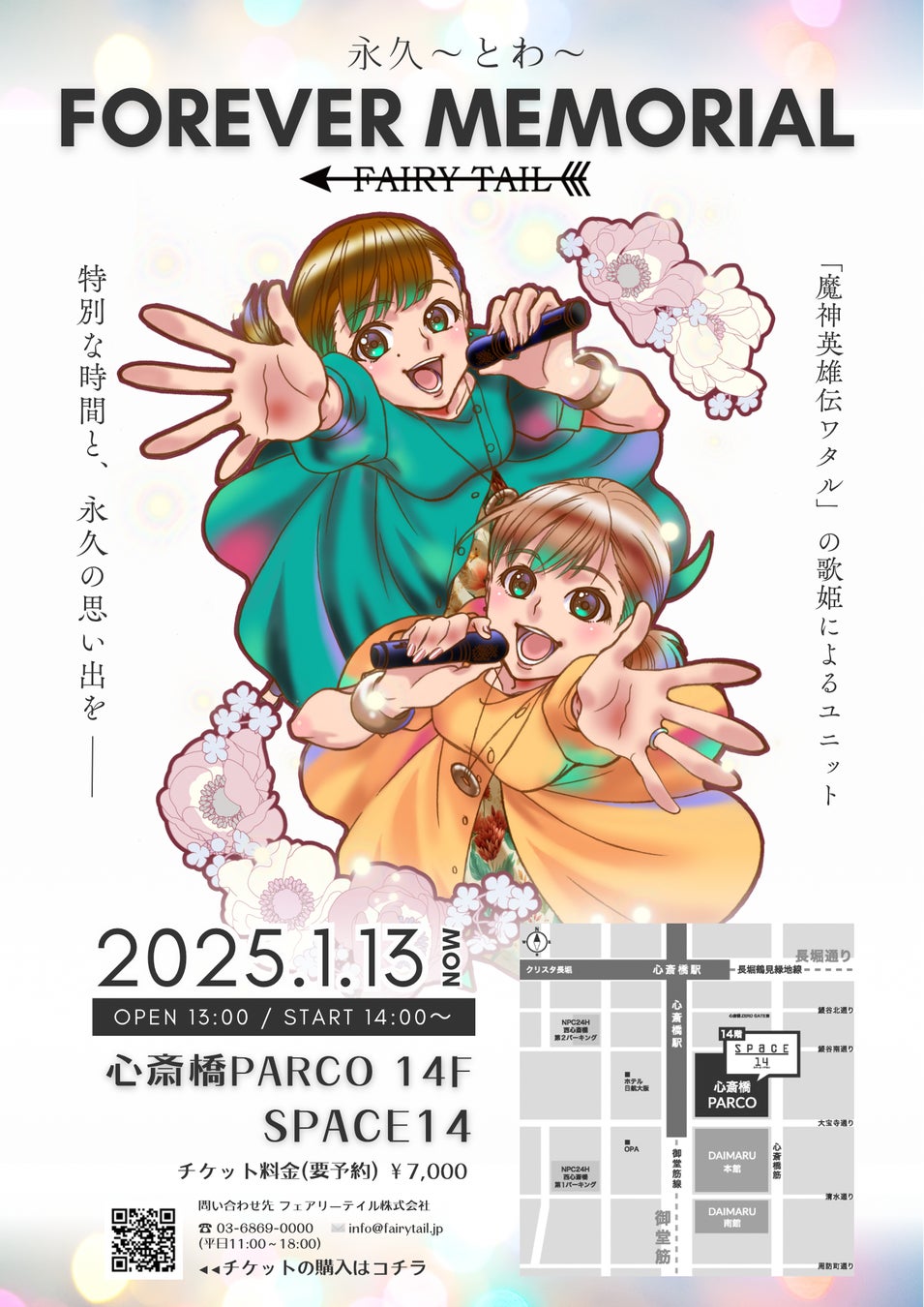 香水の輸入販売を手がけるフェアリーテイル株式会社(東京都港区)は、2025年1月13日(月・祝)に、「SHINSAIBASHI PARCO 14F SPACE14」で、「永久~とわ~」のライブを開催します。チケットは、当社ホームページの特設ページより購入可能です。※当日は配信はありません。