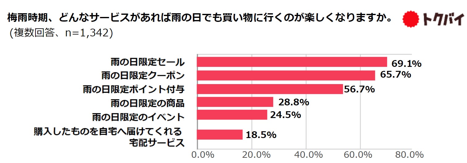 雨の日でも買い物に行きたくなるサービスは「雨の日限定セール」69.1%、「雨の日限定クーポン」65.7%、「雨の日限定ポイント付与」56.7%