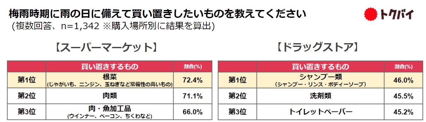 ~梅雨時期に買い置きしたいもの、スーパーは「根菜」、ドラッグストアは「シャンプー類」がトップ~