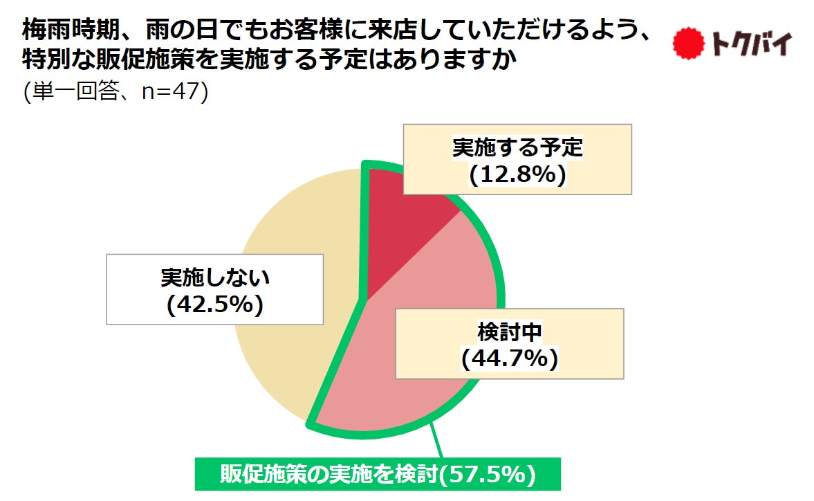 スーパーマーケットをはじめとする「トクバイ」の導入企業に雨の日の来店客数についてたずねたところ、9割以上が「来店客数が減る」と回答しました。梅雨時期において、セールやクーポンなど雨の日の販促施策を実施する予定があるかたずねたところ、約6割が販促施策を検討していることがわかりました。具体的な施策としては「雨の日限定セール」「雨の日限定ポイント付与」などがあがりました。