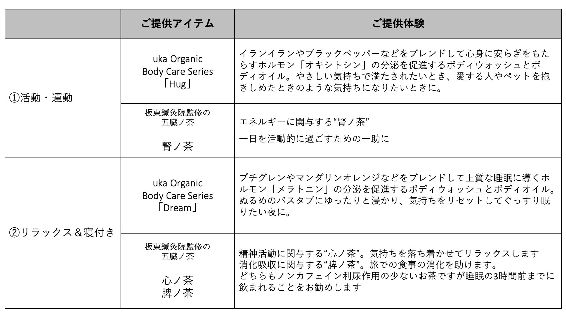 【プランの楽しみ(ご提供アイテムと体験)】