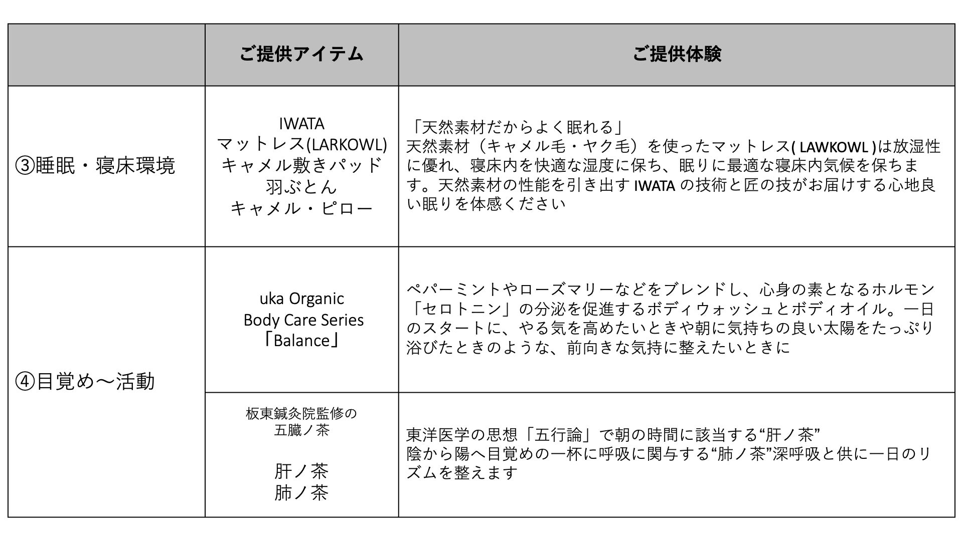 本プランは、IWATAのパーパスである「自然との調和を眠りから」を体感いただくプランとして、IWATAがプロデュース、nol kyoto sanjo、uka、板東鍼灸院とのコラボレーションで実現いたしました。